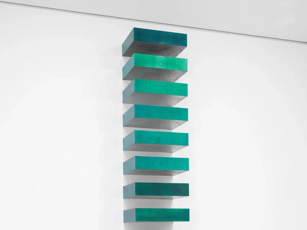 Detail of untitled stacked work by Donald Judd, showing repetition, proportion, and precise material edges in teal anodized aluminum. Credit: © Judd Foundation.