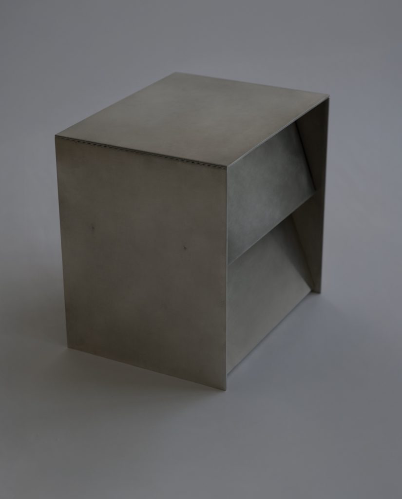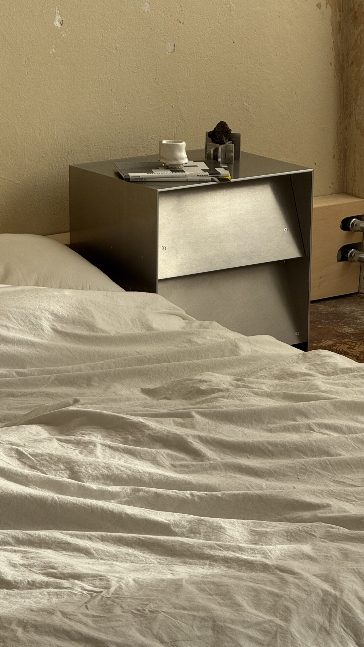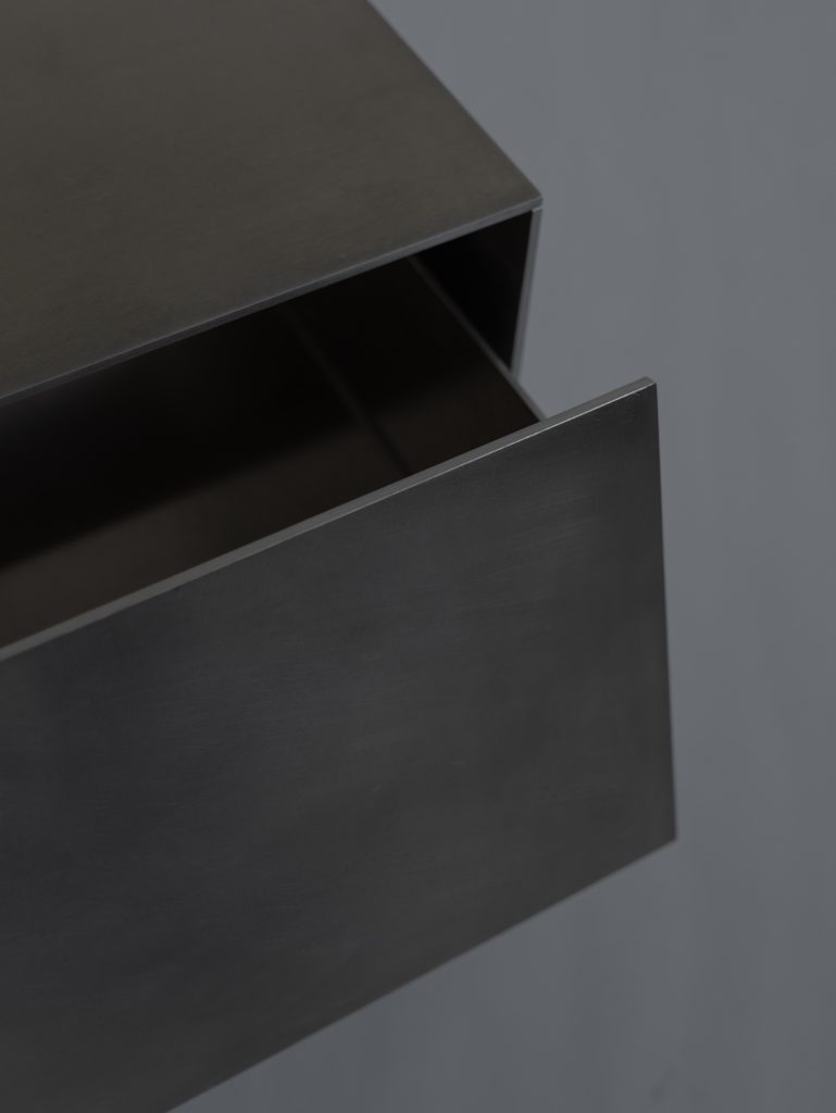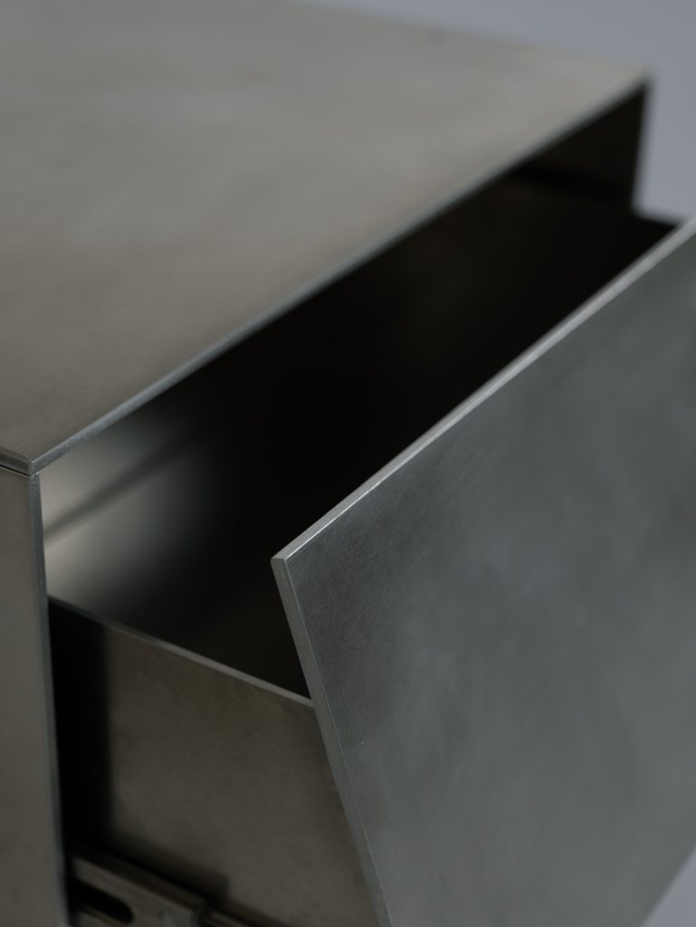 Produced by hand in an atelier near Berlin, Drawer 440 is crafted entirely from aluminum. Each unit undergoes a meticulous process of hand sanding and polishing before being finished with natural beeswax. This treatment gives the surface a soft, tactile sheen while reducing fingerprints, allowing subtle marks and irregularities to remain visible. Rather than concealing these traces, the object embraces them as evidence of its artisanal origins, positioning Drawer 440 in quiet opposition to anonymous industrial perfection.