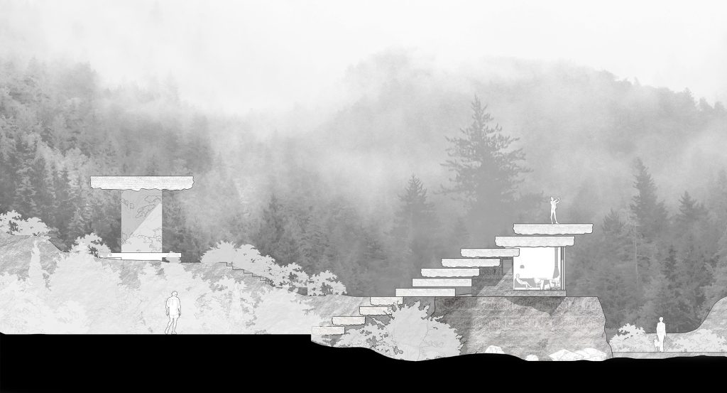 As cloud reflections drift across mirrored surfaces and tree shadows slide over the stone steps, the project offers a form of temporary stillness. It is less a destination than a pause in motion, a place where the mountain’s scale is not conquered, but quietly acknowledged.