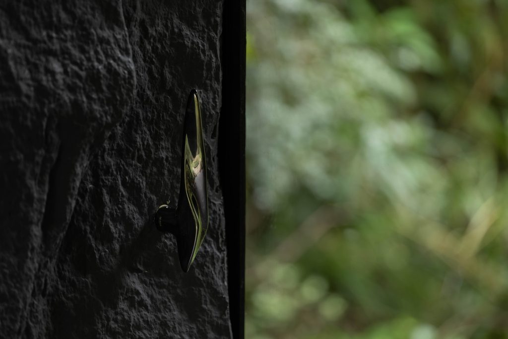 Nearby, a second element, The Hut, sits on the hillside and functions as a restroom. Reached by cobblestone paths, it is designed as a quiet surprise rather than a service building. Mirror surfaces pick up foliage and sky, reducing the object to a shifting outline that appears and disappears as one approaches.