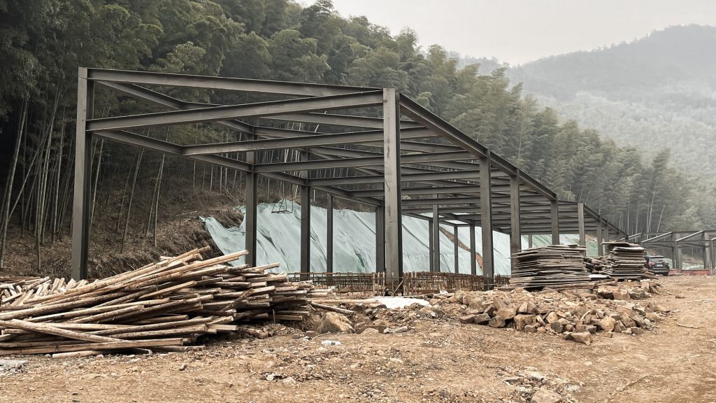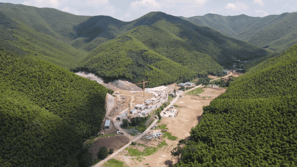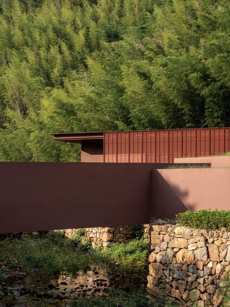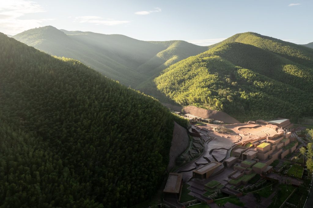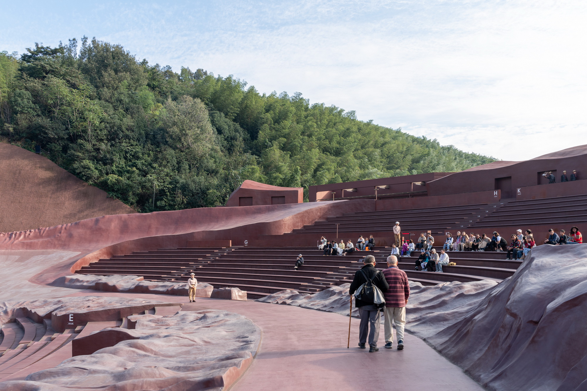 The commission began in twenty twenty one with a request from Yaohu Town to create an open air theater for an ecological narrative performance. The site is located at the untouched end of a valley that opens in several directions, a gentle landform that suggested a minimal intervention approach. Rather than elevating volumes above ground, GOA placed much of the theater beneath the existing terrain so that the architecture reads as part of the valley itself.