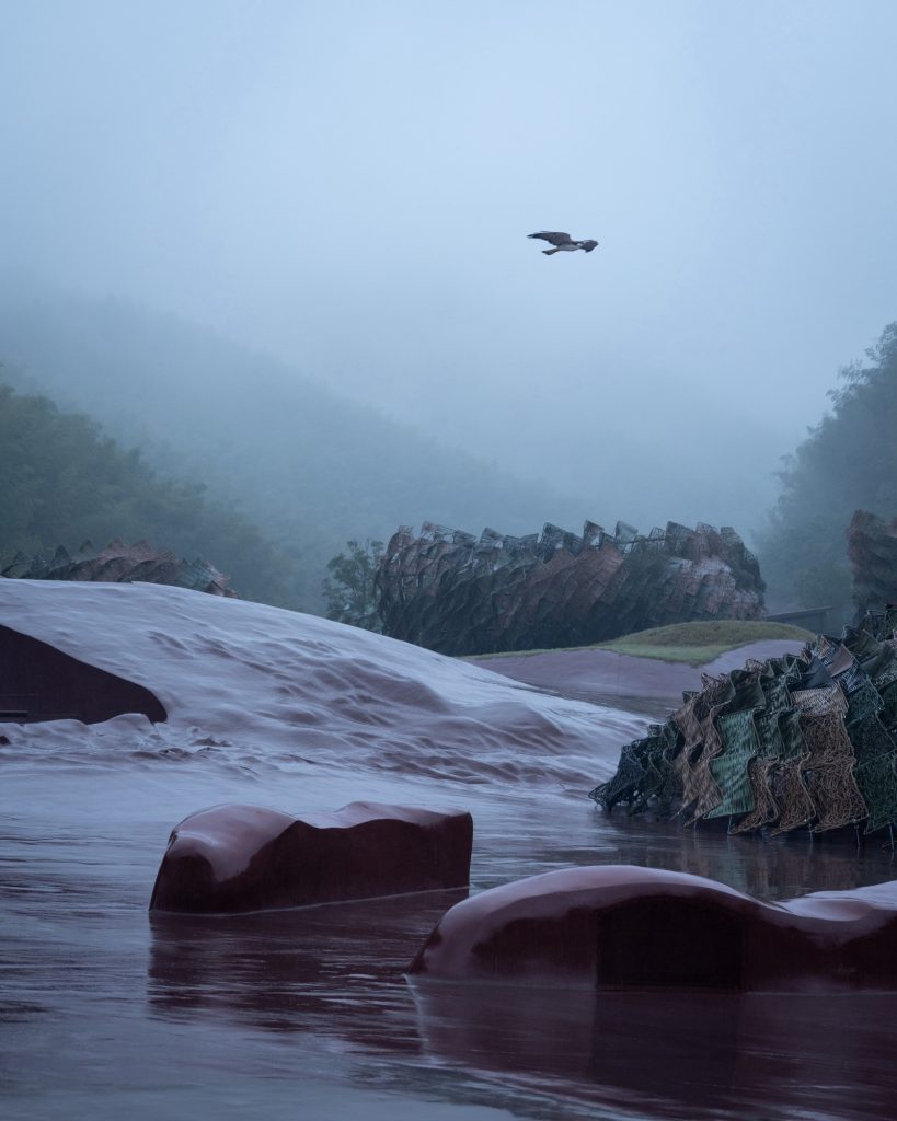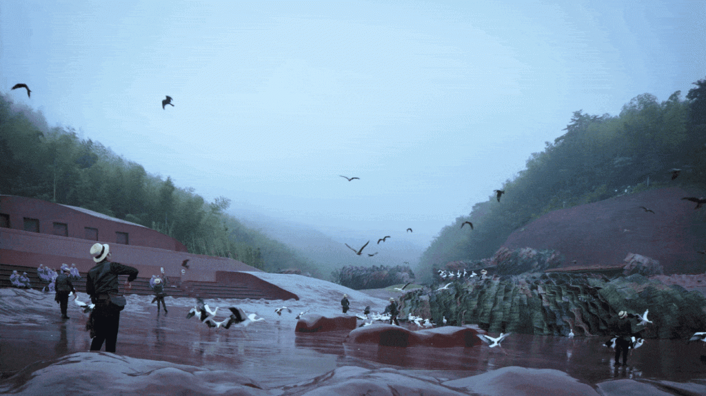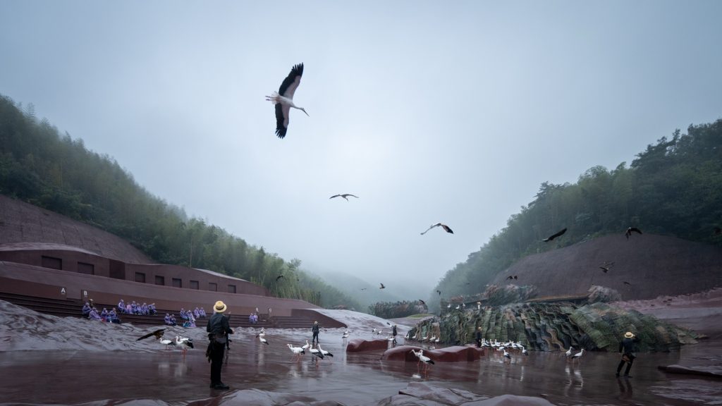 A secondary valley intersects the main one and extends toward a bamboo grove. This quieter corridor houses the aviaries, keeping them sheltered from human disturbance. Here, the terrain becomes an essential stage device. At the dramatic climax, flocks of white storks emerge from the narrow valley passage in synchrony with sound and light, transforming the landform into a three dimensional backdrop.