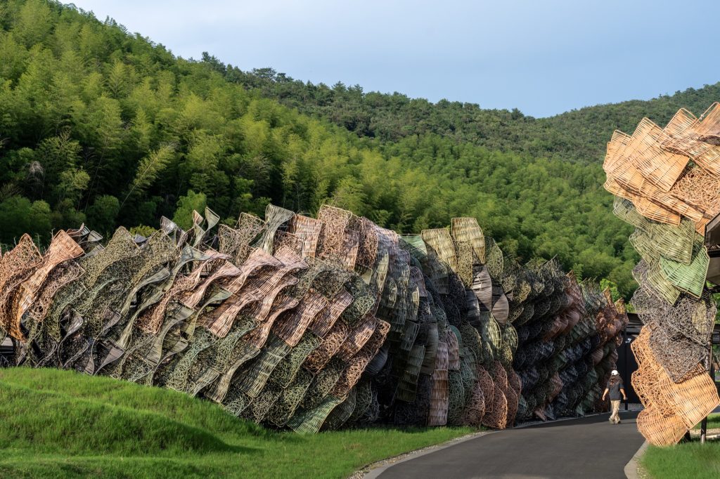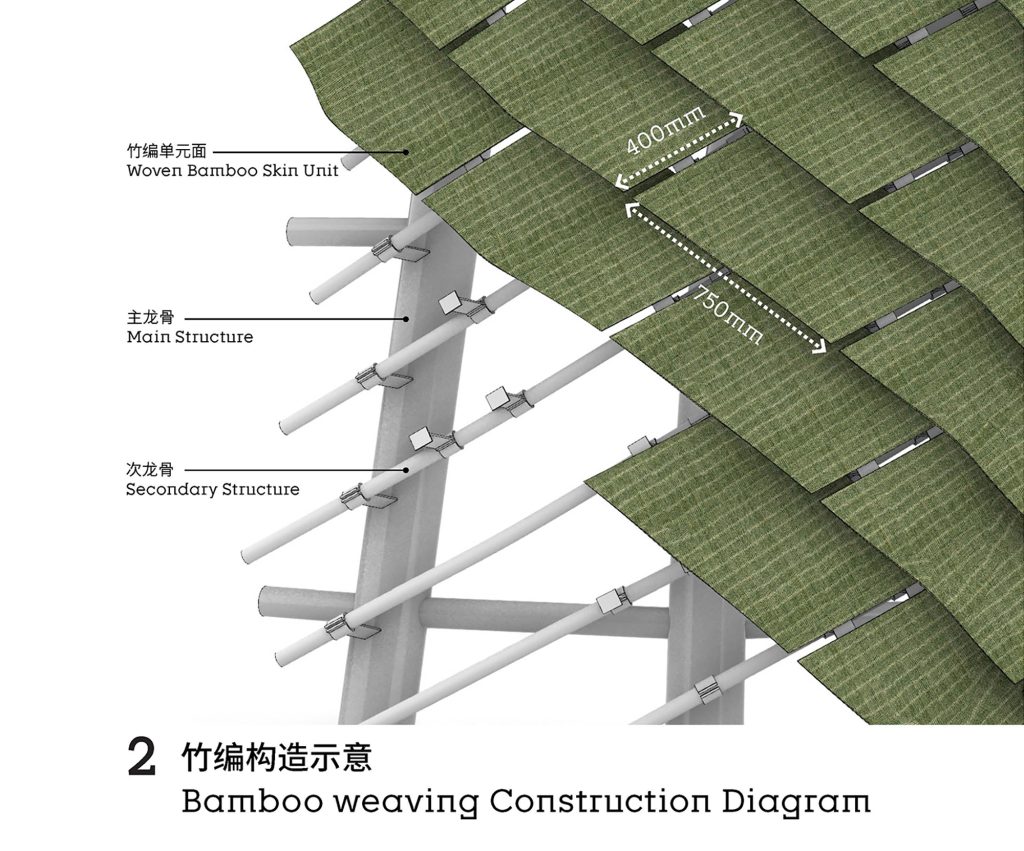 Bamboo appears in the stage installation and the outer envelope of the aviaries. For durability, the design uses high density polyethylene engineered to resemble woven bamboo fibers. Panels in three tones create a subtle, shifting facade as light moves across the valley.