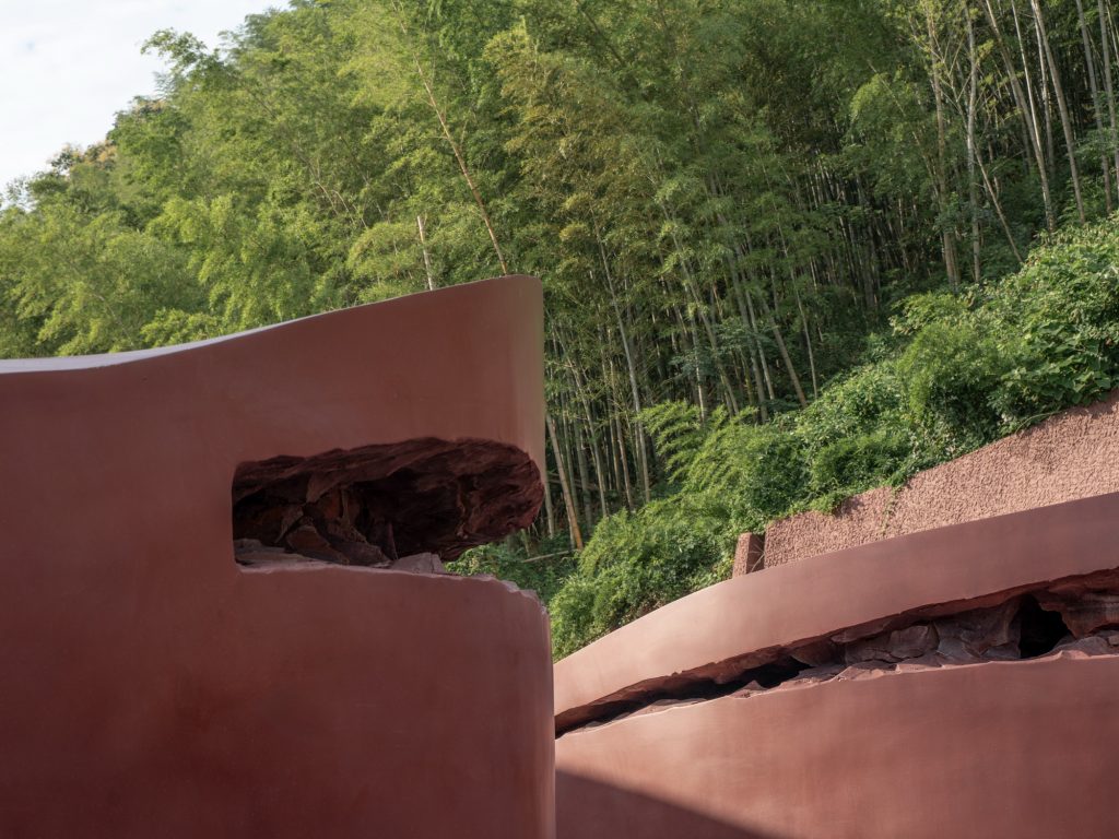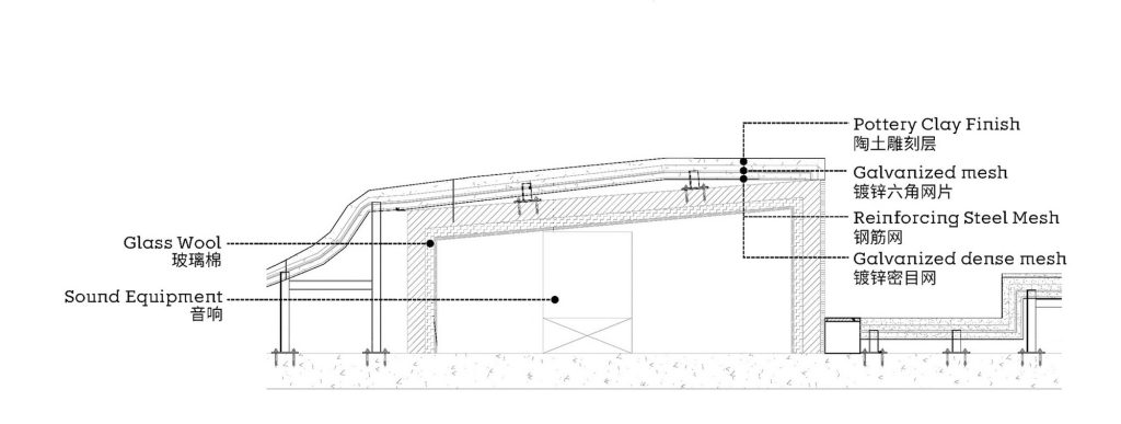 Yixing’s deep tradition of pottery and its surrounding bamboo forests shaped the material language of the theater. GOA transformed these local motifs into durable forms capable of withstanding climate and time. Clay is expressed in raw earth, in malleable surfaces, and in terracotta like textures. The carved concrete of the plinth was first CNC shaped to control its geometry, then hand sculpted on site to retain the tactile presence of pottery.