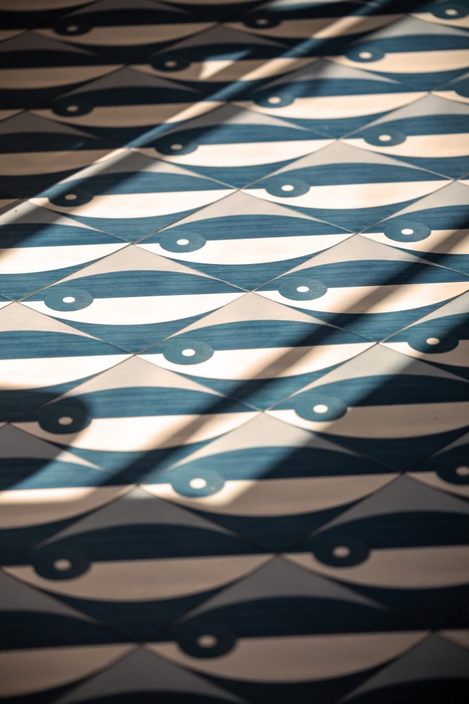 The material palette reinforces this duality. Deep oceanic blues are set against warmer golden tones, evoking shifting moments of light from midday to sunset. Rather than contrast, the palette operates through gradation, allowing the space to feel fluid and atmospheric.