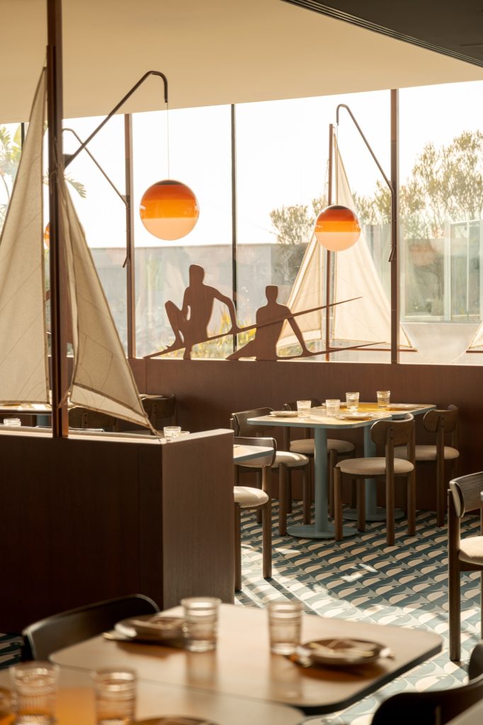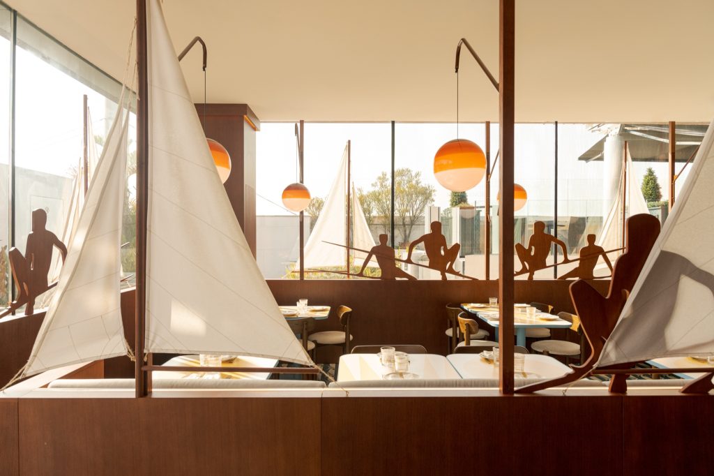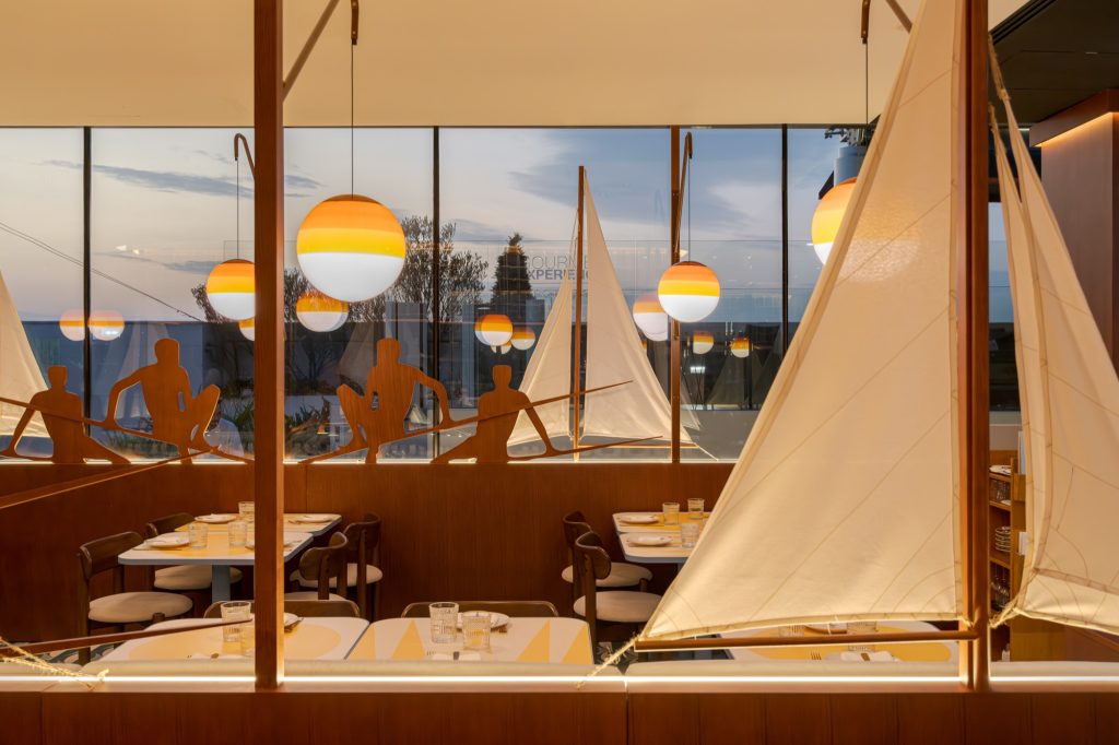 Wood defines the spatial envelope, wrapping the interior in a continuous surface that recalls the cabins of a sailing vessel. This gesture establishes both intimacy and direction, as if the restaurant itself were a vessel in motion. The sensation is immersive yet controlled, balancing enclosure with openness toward the surrounding city.