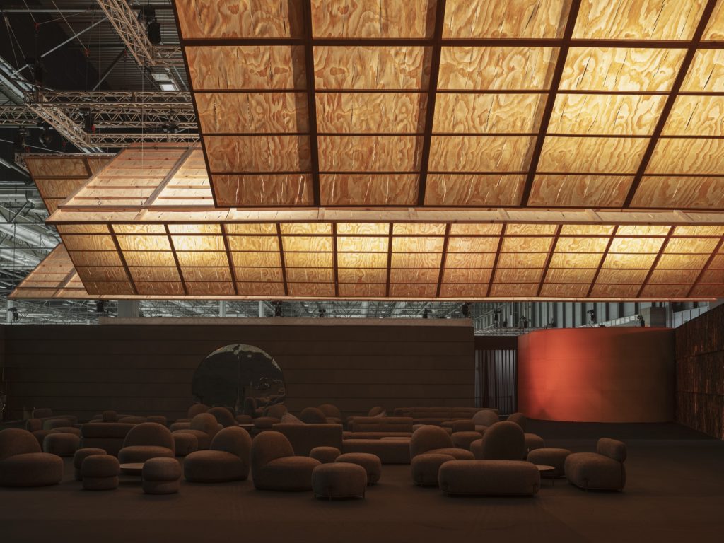 The pavilion’s canopy emerges from the cabinet yet resists conventional structural logic. Inspired by the precarious compositions of Fischli and Weiss, the architects introduce a deliberate imbalance into the system. A column that would normally provide support is removed, creating a sense of structural uncertainty that is resolved through counterweight and tension.