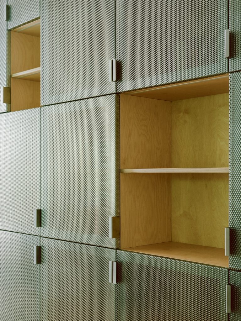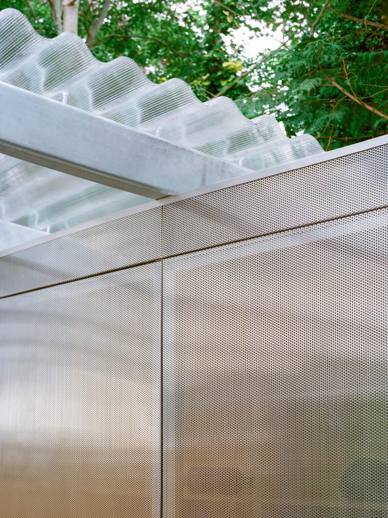 A perforated stainless steel screen runs along the cabinet, producing a constantly changing visual condition. Depending on light and movement, it alternates between reflection and transparency, revealing and concealing the contents behind. This shifting surface allows the pavilion to oscillate between object and atmosphere, extending interior conditions outward while drawing the surrounding garden into the architectural experience.