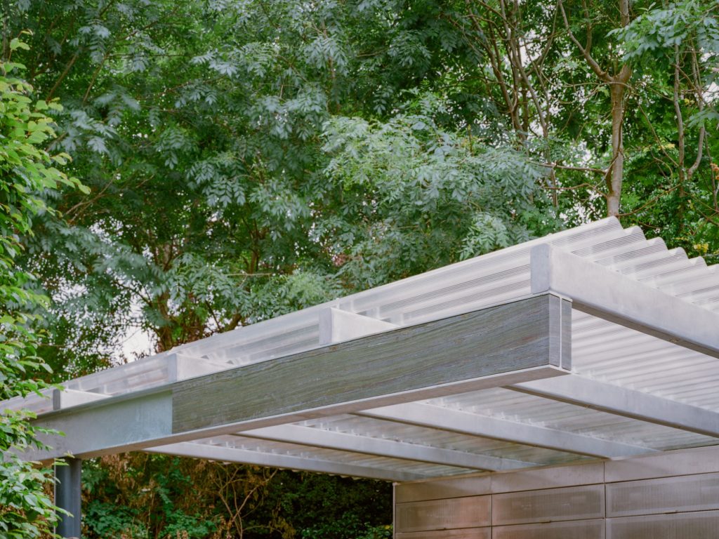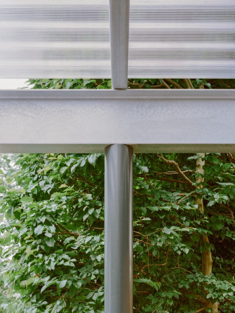 This equilibrium is achieved through a carefully orchestrated assembly of materials. A precisely milled marble block is inserted into a galvanized steel beam, acting as a counterweight, while a tension rod anchors the structure to a concrete mass concealed below ground. The result is a canopy that appears to hover lightly, despite the visible complexity of forces at play.