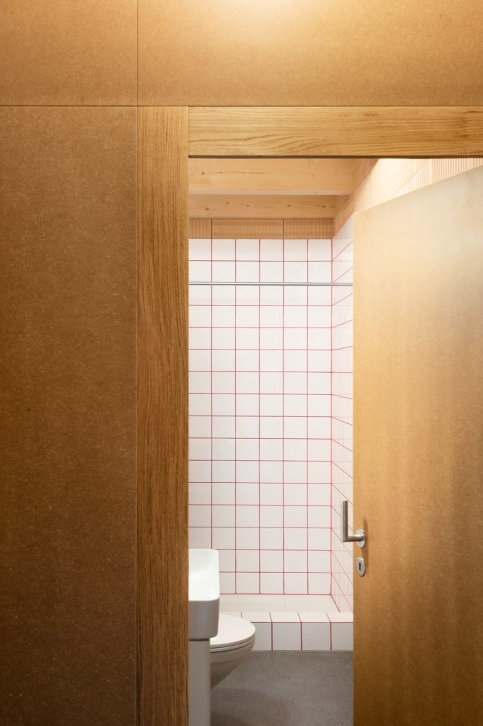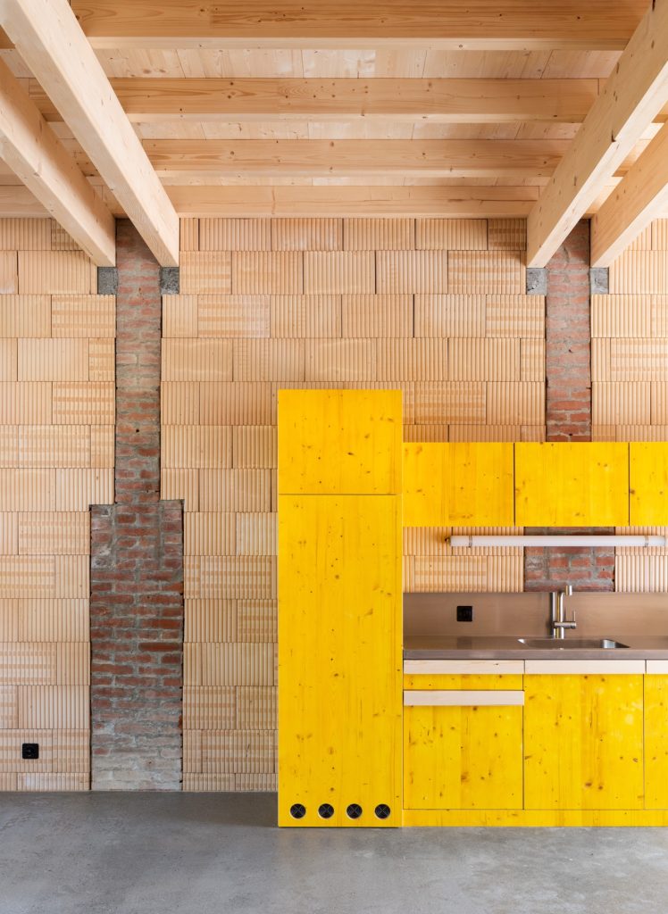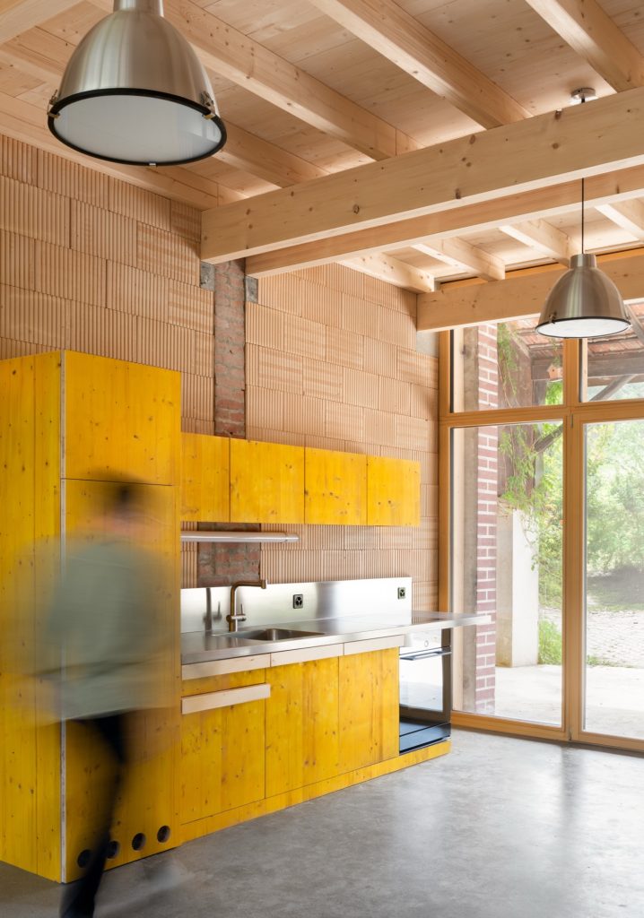 Material choices further reinforce the continuity between past and present. The floor is finished in a raw trowelled screed that recalls the tactile character of traditional stable surfaces. In the kitchen, cabinetry constructed from formwork panels evokes the improvised constructions commonly found in agricultural outbuildings. Together, these elements create an atmosphere that remains rooted in the building’s rural memory while accommodating contemporary domestic life.