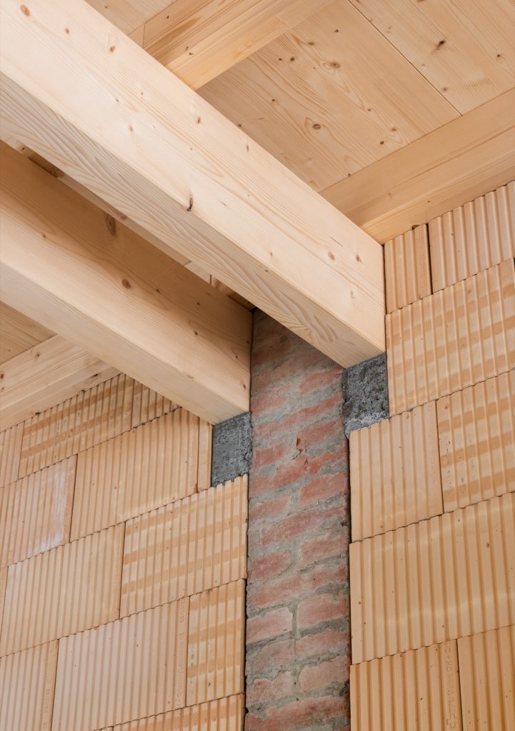 New interior walls are constructed in exposed terracotta brick, echoing the materiality of the original masonry. Their slightly different dimensions subtly distinguish contemporary additions from the historic fabric. This approach recalls the restoration philosophy of the German architect Hans Döllgast at Munich’s Alte Pinakothek, where new elements were integrated in a way that acknowledged the passage of time rather than concealing it.