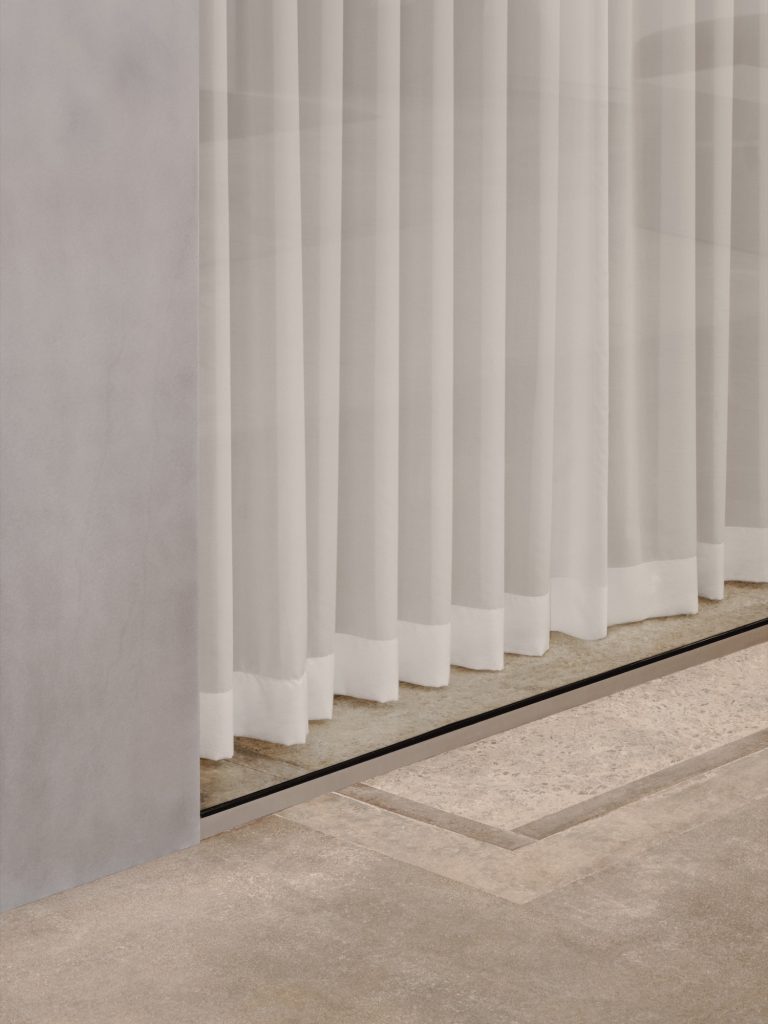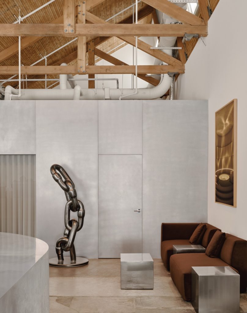 At the core of the plan, the architects inserted a hand brushed metal cube that organizes the gallery’s public and private areas while retaining a clear reading of the original structural volume. White painted acoustic walls create flexible exhibition surfaces and form a crisp counterpoint to the preserved material palette. The overall strategy reflects L’Abri’s commitment to contextual coherence, material sobriety, and the revalorisation of heritage buildings as a sustainable response to contemporary urban challenges.