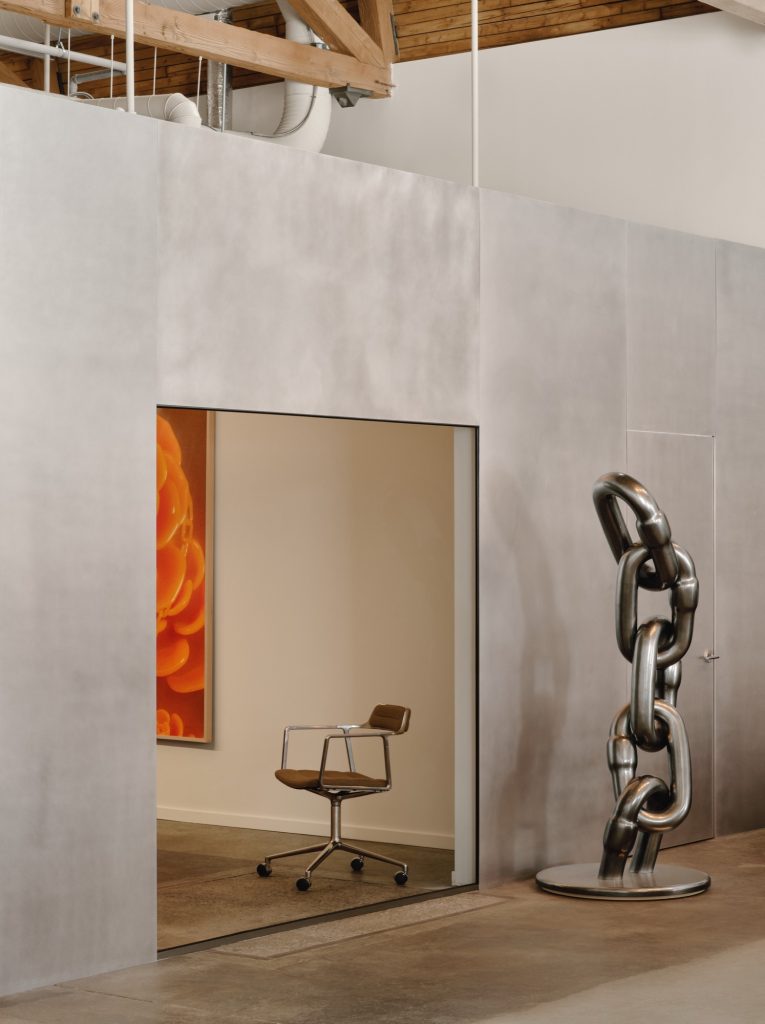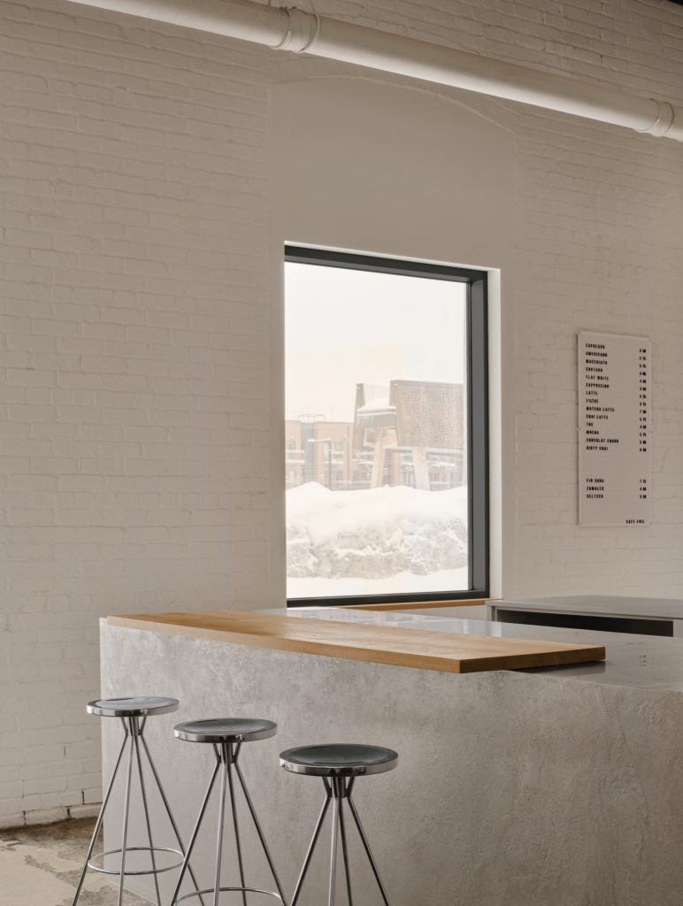 The gallery’s luminous café opens toward Parc des Gorilles through a full height glass garage door, offering a welcoming threshold between city and interior. The curved counter, finished in artisanal microcement, introduces a soft minimalism that complements the raw structure. Custom furnishings by Montreal designer Raymond Raymond bring a warm and understated functionalism that balances the rigour of the architecture. At the rear, a dedicated projection room creates an intimate environment for immersive and audiovisual works. The metal cube also accommodates a meeting room furnished with a large table by Essai Mobilier and Vipp chairs, articulating an aesthetic that bridges local craftsmanship with enduring design references.