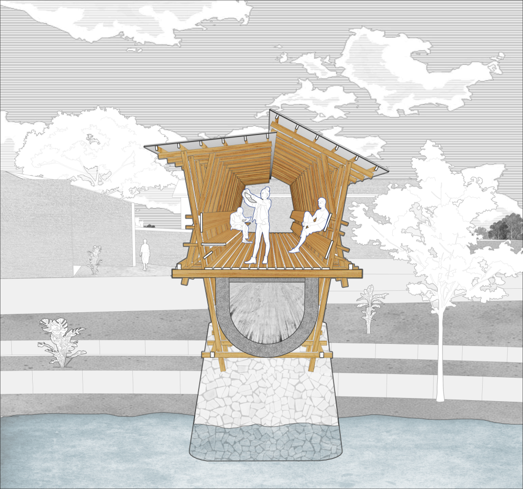 These stories led us to rethink the bridge not as a purely traffic-oriented structure, but as a semi-public social space embedded with memory. Environmental comfort therefore became a key driver of the design. The covered bridge provides shade and protection from rain, while its open and permeable structure allows air to move freely. Two separated roof planes, offset in height, create a continuous gap that enhances natural ventilation and cooling within the bridge.