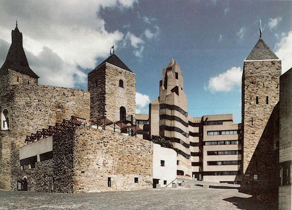 That idea of connection becomes even clearer when Neviges is placed beside Böhm’s civic work. Bensberg Town Hall in Bergisch Gladbach, built between 1962 and 1972, is among the most powerful examples of his ability to join new construction with historic residue. The building occupies the site of the ruins of an old medieval castle. Böhm did not erase the remains. Instead, he integrated them into the new complex, so that the town hall becomes both a contemporary civic machine and a continuation of the hilltop’s historical layers. A sculptural stair tower stands as a focal element, and glazing on the ground floor opens the complex to the public realm. Here, the connection is not metaphorical. It is literal: medieval stone and modern concrete meeting in a single civic figure, acknowledging time without imitating it.