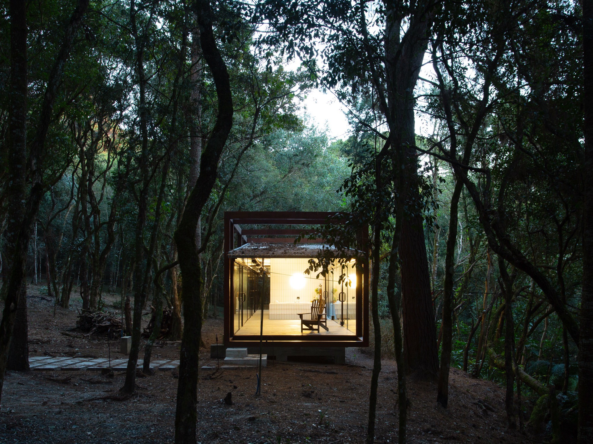 We used tempered glass so the gaze encounters no resistance. From certain angles, the pavilion almost vanishes. The eye passes through it to discover the forest beyond. Achieving this lightness requires discipline. The structure must remain silent. We reduced thickness, eliminated the unnecessary, and focused only on what was essential.