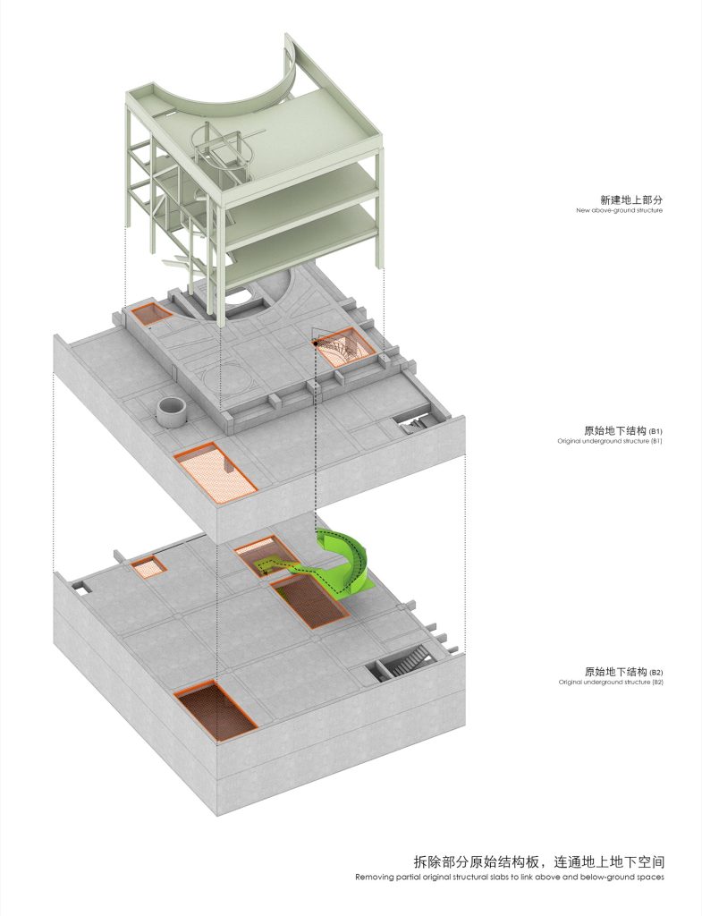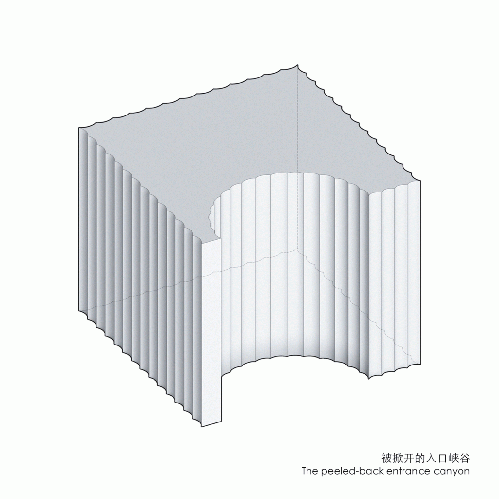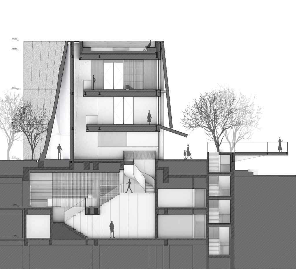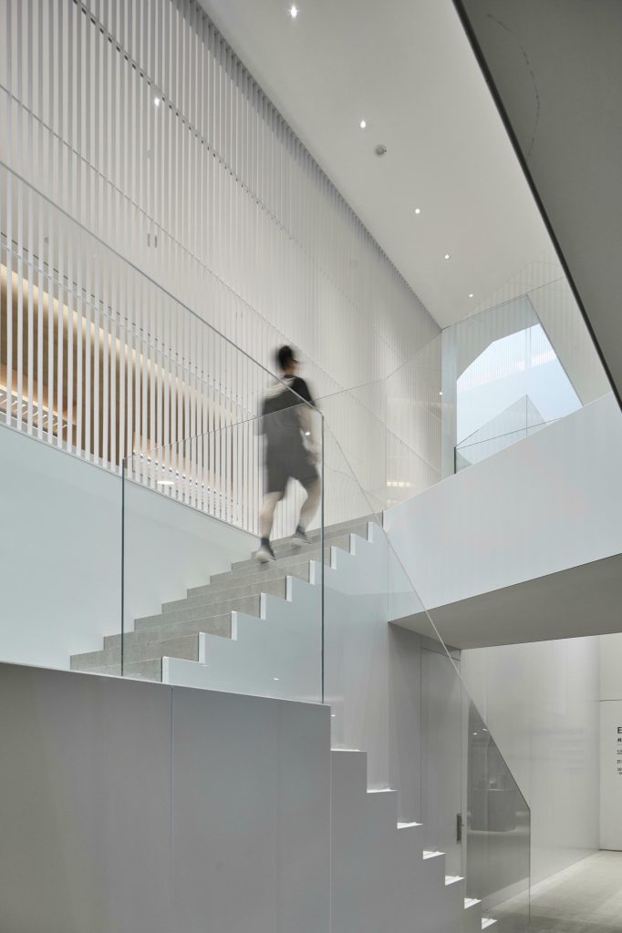 A staircase climbs along the side wall, its movement partially revealed through the perforated facade. From the city, fragments of circulation appear and disappear, projecting the museum’s internal vitality outward. To connect the underground galleries with the world above, portions of the existing slabs were strategically removed. This incision allows natural light and glimpses of landscape to penetrate the basement, integrating above and below into a continuous spatial sequence.