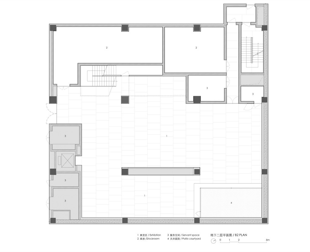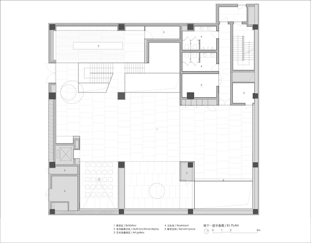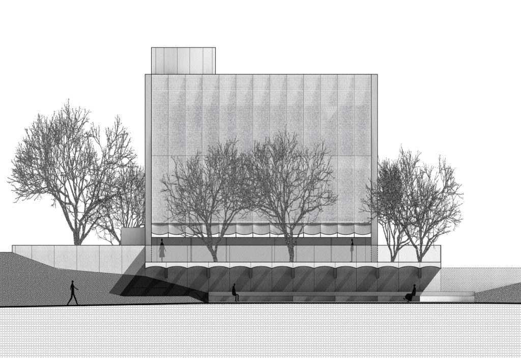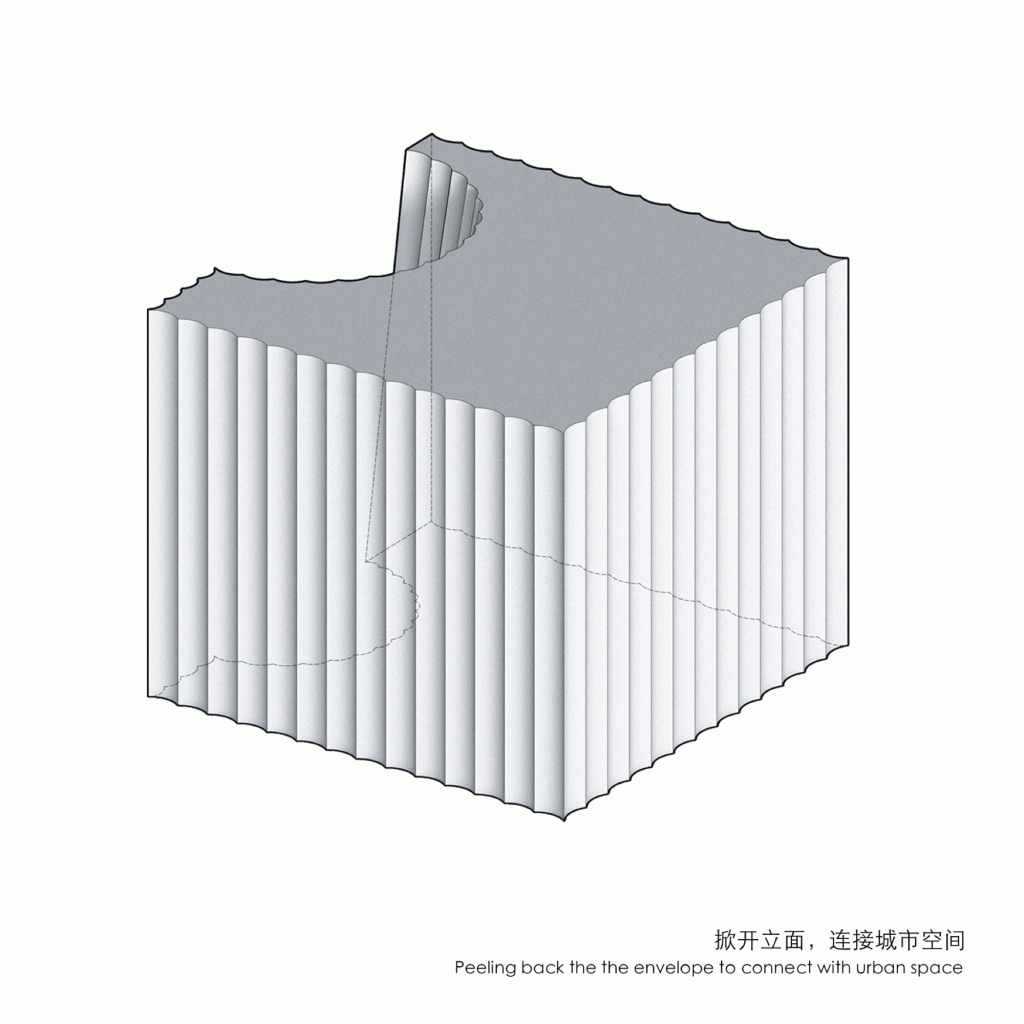 A staircase climbs along the side wall, its movement partially revealed through the perforated facade. From the city, fragments of circulation appear and disappear, projecting the museum’s internal vitality outward. To connect the underground galleries with the world above, portions of the existing slabs were strategically removed. This incision allows natural light and glimpses of landscape to penetrate the basement, integrating above and below into a continuous spatial sequence.
