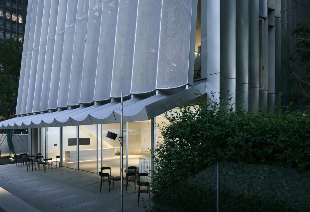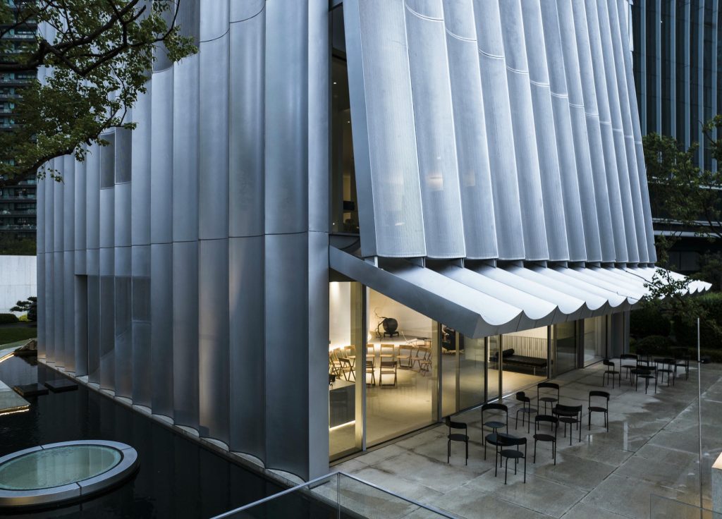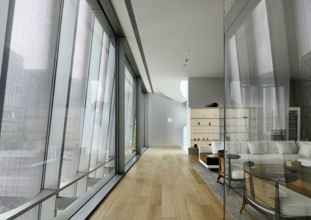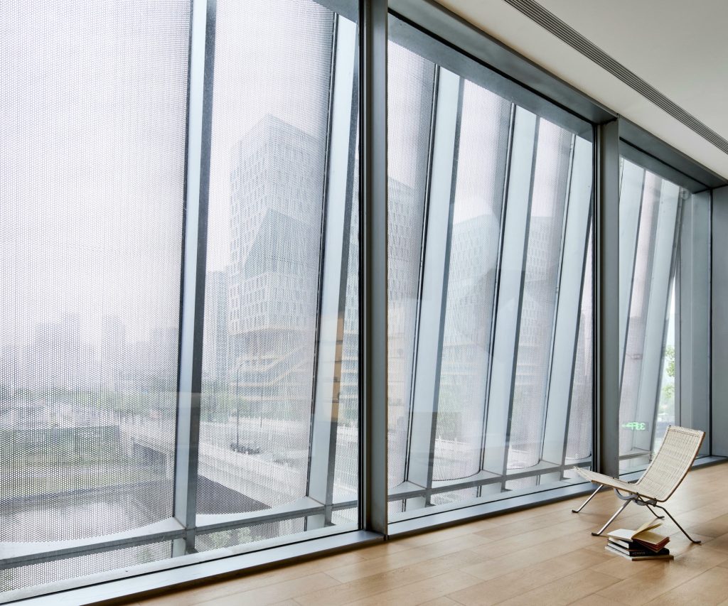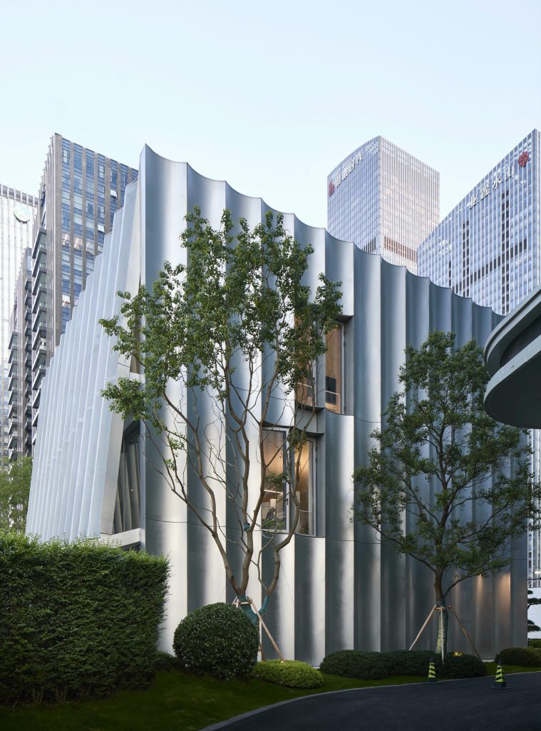 Light animates the metal skin. As daylight grazes the curved surfaces, subtle reflections soften the industrial material, lending the volume an unexpected tenderness. On the north facade, perforated panels modulate sunlight and reframe the surrounding city as a blurred, almost painterly panorama. The urban landscape becomes an abstract scroll, filtered through a delicate metallic veil.