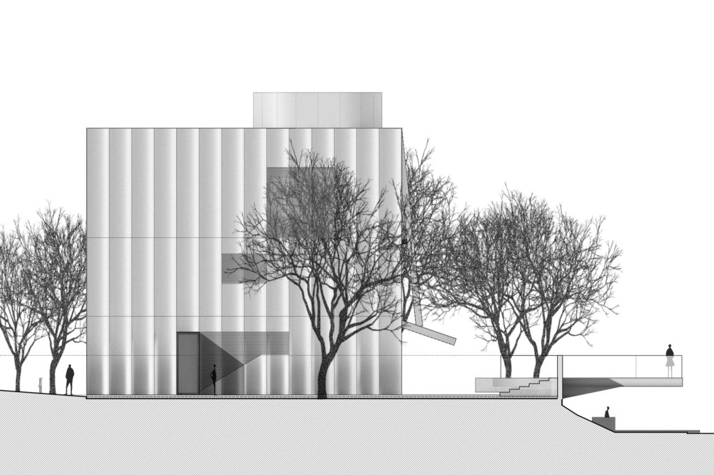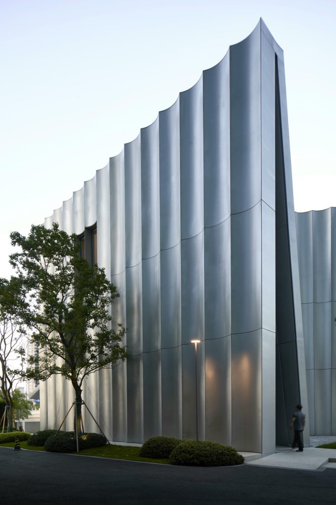 Facing a river and positioned beside a major urban artery, the museum addresses the city with a deliberate gesture. The facade oriented toward the street appears peeled open, forming a shell that is both autonomous and porous. The entire exterior is wrapped in curved stainless steel panels whose inherent tension allows them to span without secondary purlins, producing a taut and rhythmic envelope.