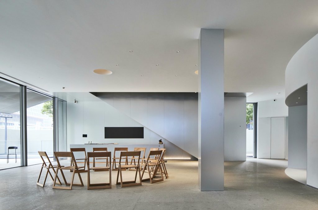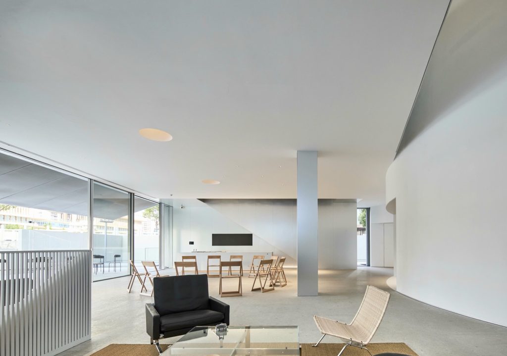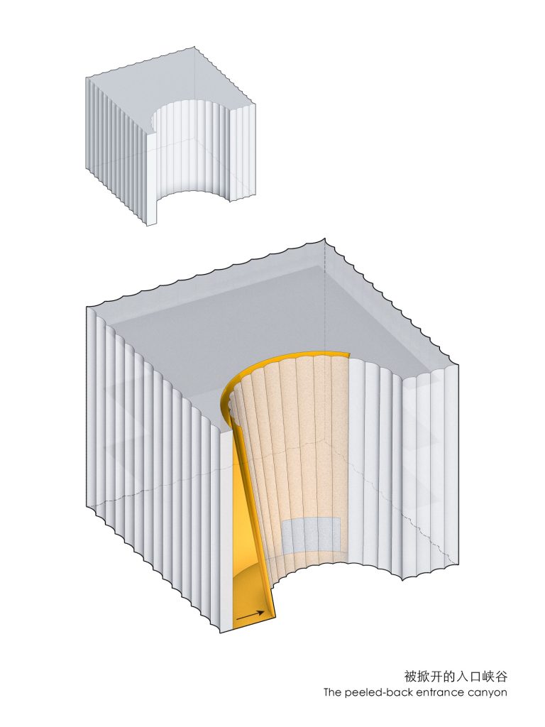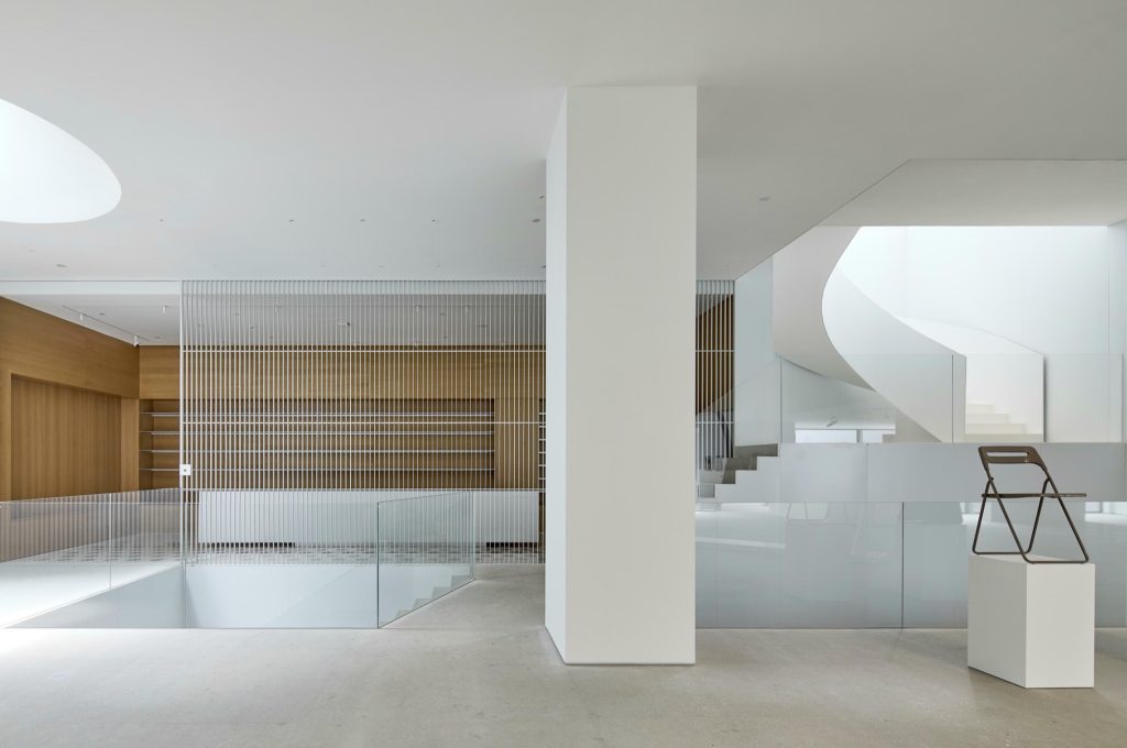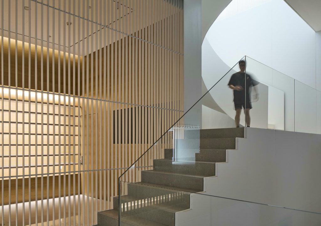The entrance is recessed within a semicircular concavity that draws visitors inward. This centripetal form enhances the building’s connection to the neighbourhood, transforming arrival into a collective gesture. A slit in the roof admits natural light into a three storey void described as a spatial canyon, guiding visitors through a gradual psychological transition from everyday urban life to the contemplative realm of art.