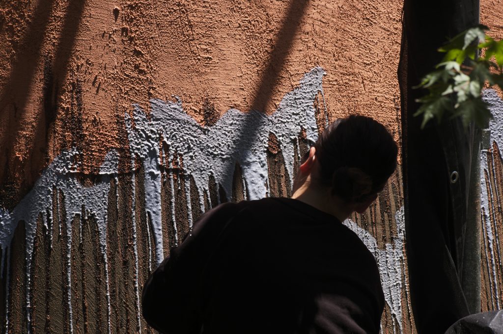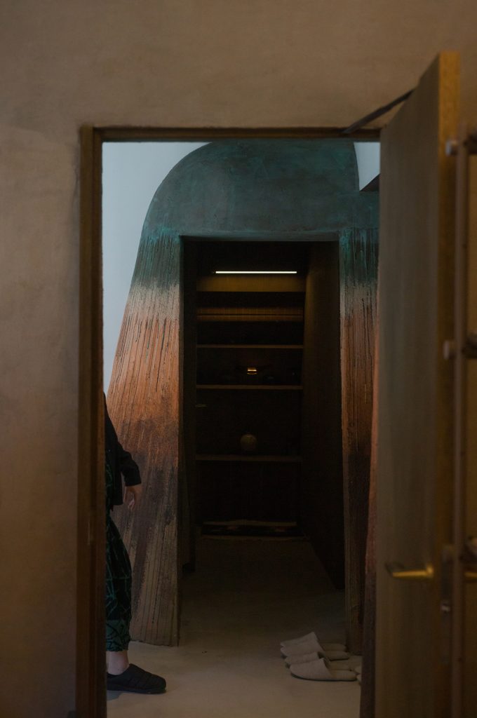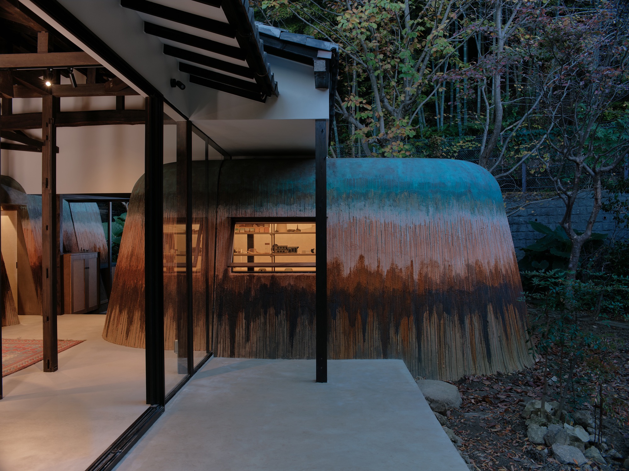 Set against steep cliffs carved with horizontal cave tombs known as yagura, the site carries an almost geological presence. Rather than impose a new architectural object onto this terrain, the architects chose to work with earth itself as both theme and medium. Soil from the land, bisque fired clay from the father’s ceramic practice, and metal powders reclaimed from a workshop were layered, poured and oxidised to produce walls that read less as constructed surfaces than as material accumulations shaped by time.