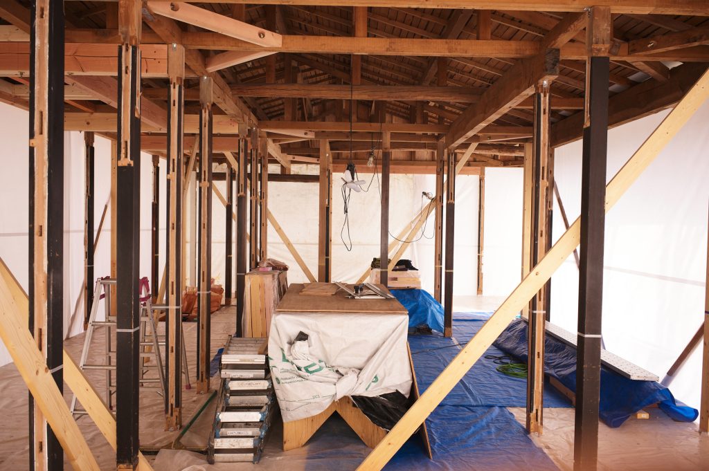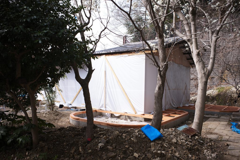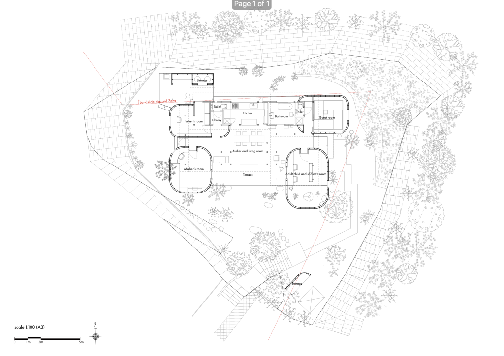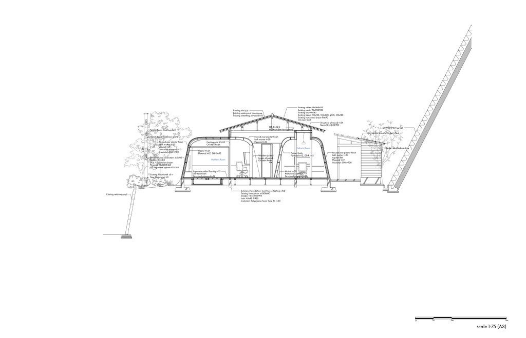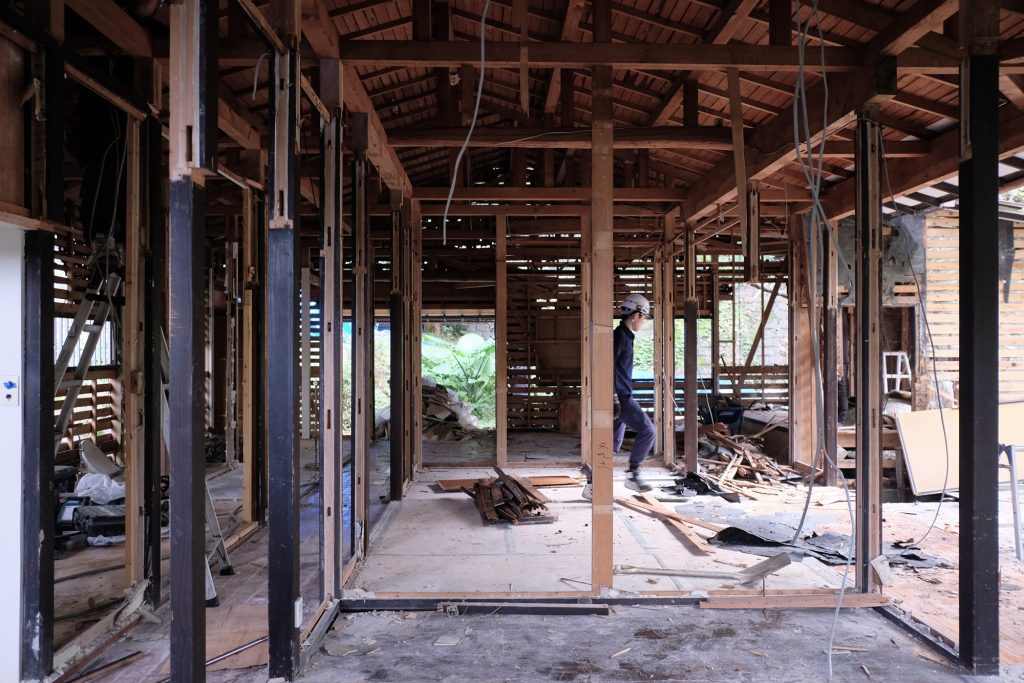 The original house, a single storey wooden structure, stood partially within a high risk zone at the base of the slope. After a typhoon triggered a landslide that blocked access and exposed its vulnerability, the most precarious portion was removed to create distance from the cliff. All interior walls and ceilings were stripped away, deteriorated sill plates replaced, and the existing columns retained to support the tiled roof.