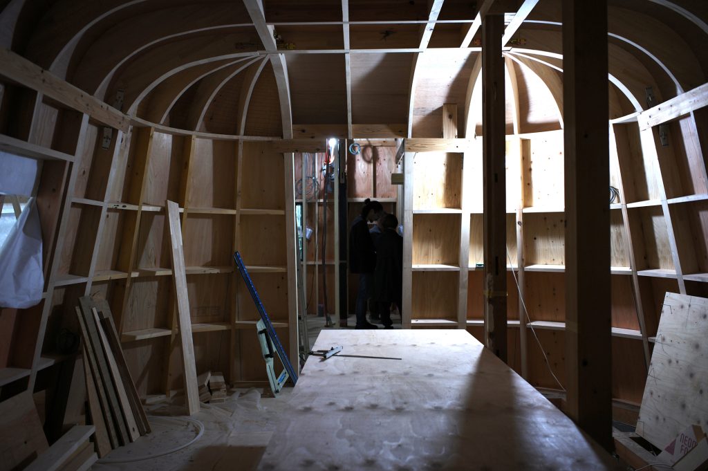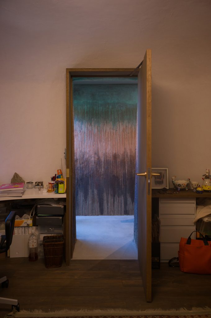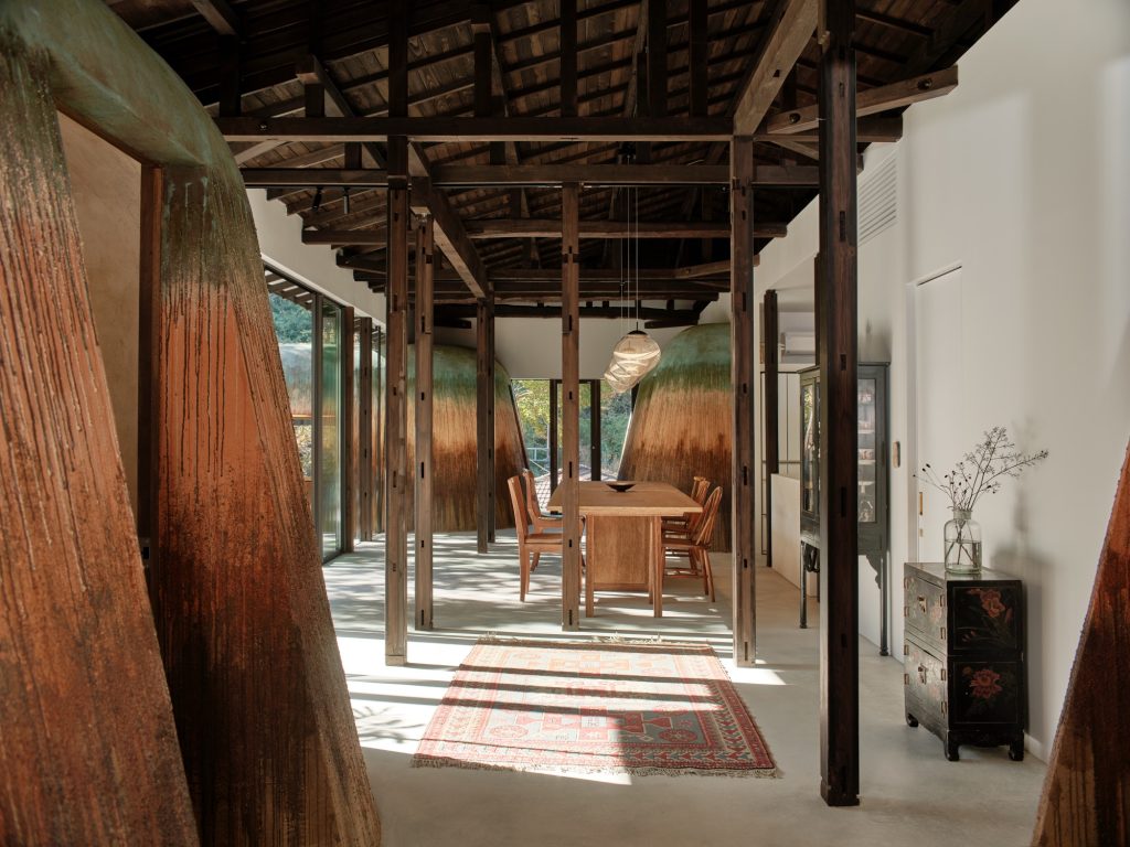 The southeast addition houses the architects themselves. The largest of the four, it features cantilevered desks displaying furniture and lighting pieces developed by the studio. Walls are coated with three layers of plaster composed of local soil and ceramic clay. Here, the floor level is lowered and finished as an earthen surface, introducing tactile variation and reinforcing the sense of inhabiting ground rather than occupying a platform above it.
