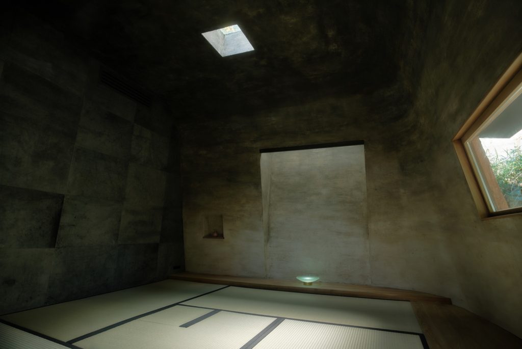 The fourth addition becomes a guest room conceived as a tea room. Four and a half tatami mats, a tokonoma alcove and a small nijiriguchi entrance establish an intimate ritual scale. Clay rich soil mixed with bamboo charcoal darkens toward the ceiling and is lit from above by a skylight, while washi paper tinted with charcoal softens the wall at the entrance.