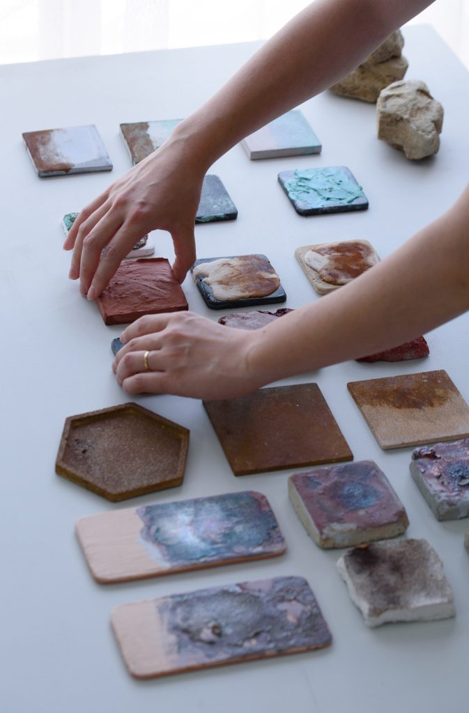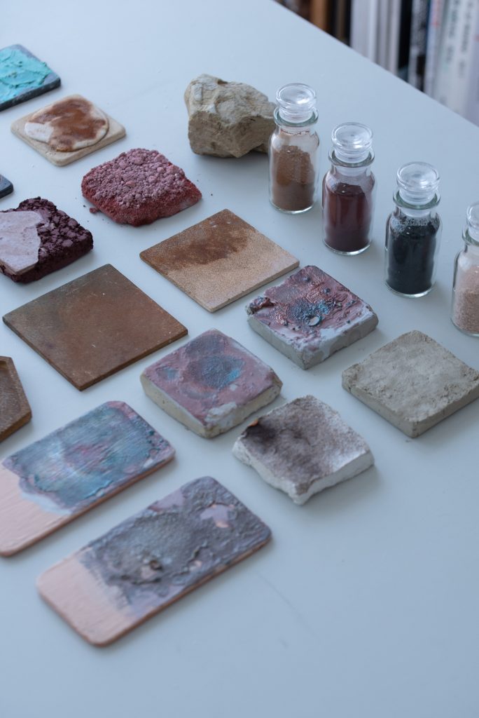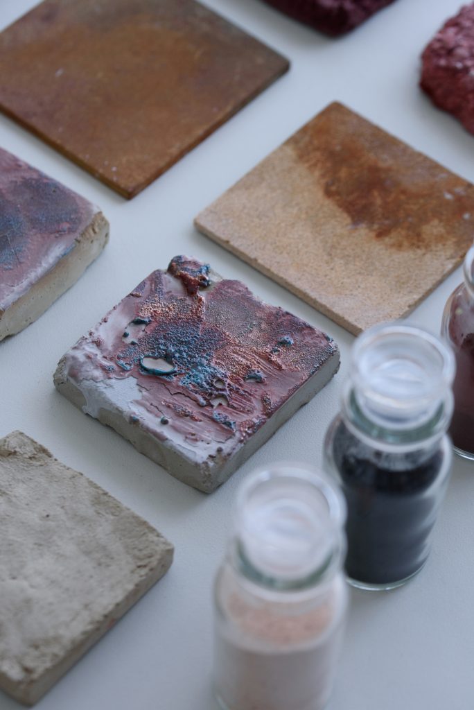 Throughout the process, experimentation preceded form. Clay rich soil was crushed, fired in the father’s kiln, glazed and scorched. Discarded clay from the studio was bisque fired and layered back onto the walls. Iron and copper powders, industrial byproducts, were poured into plaster and allowed to oxidise. Chance and time became collaborators.