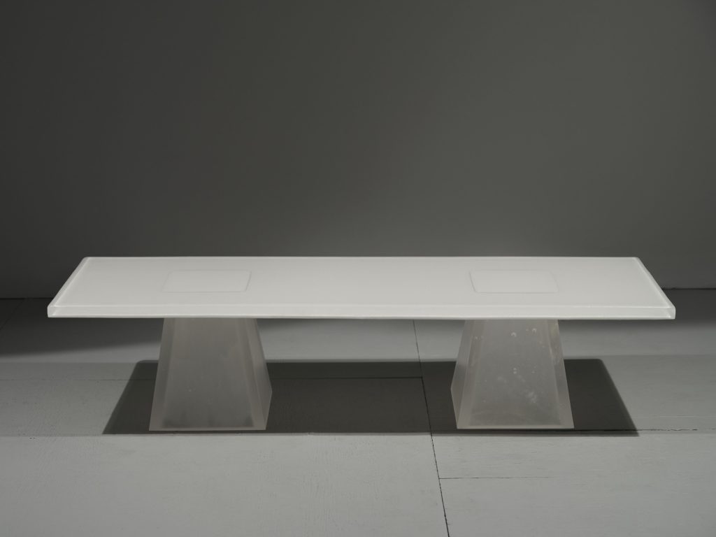 The coffee table sits within a broader family that includes bookends, a floor lamp, a mirror, and a side table, all fabricated by master glass workers in Brooklyn. Across the collection, glass is treated not as a fragile surface but as a structural medium. Light passes through thick volumes, refracting and diffusing in ways that animate the space around them. The result is a series of objects that oscillate between presence and absence, material and immaterial.