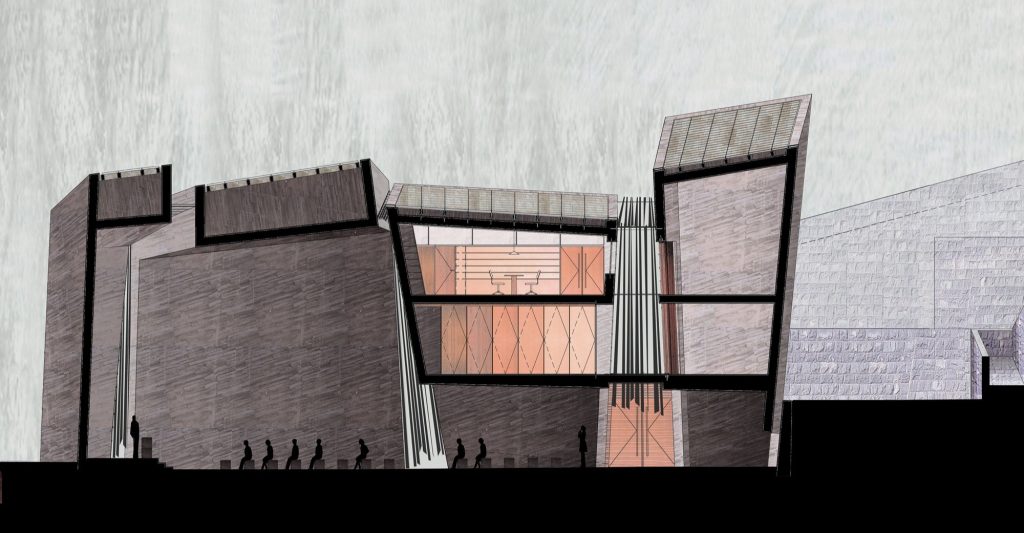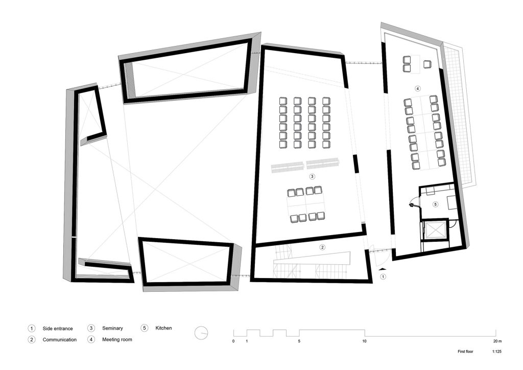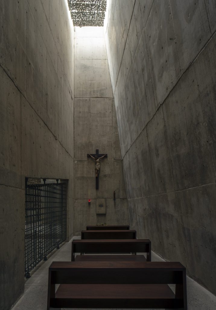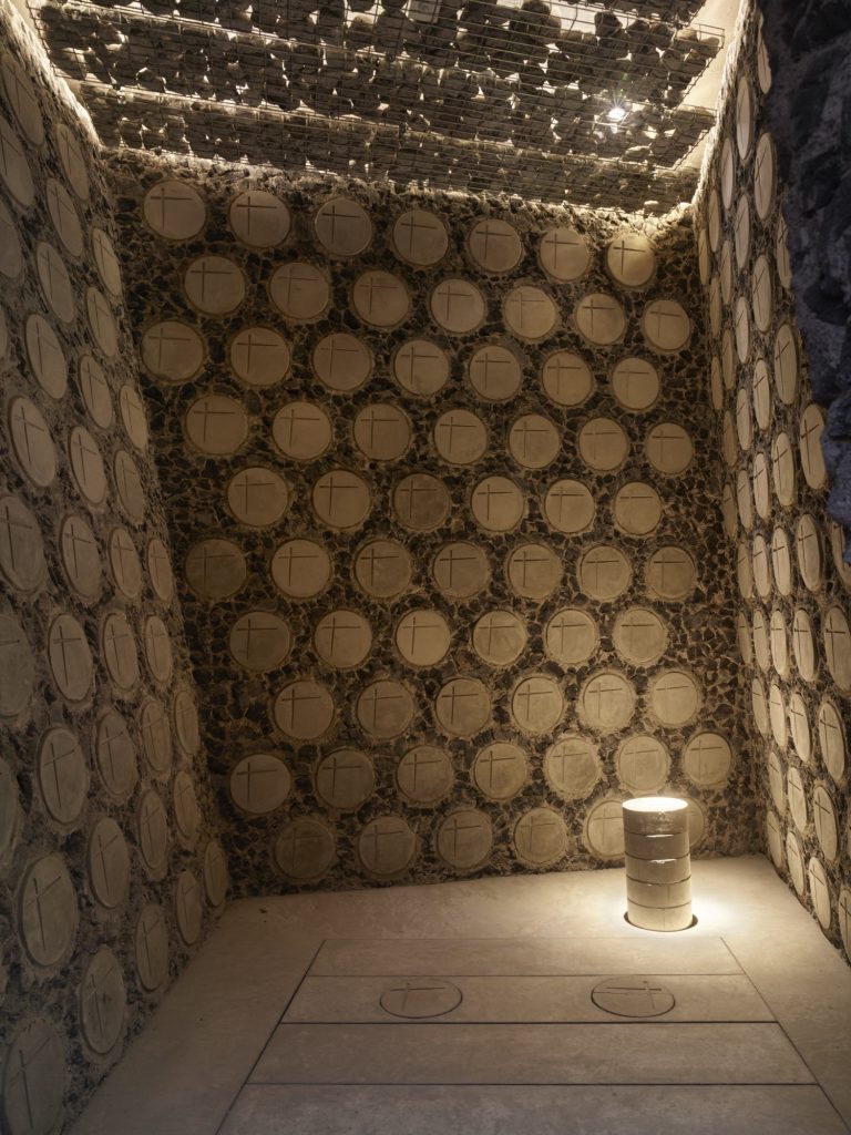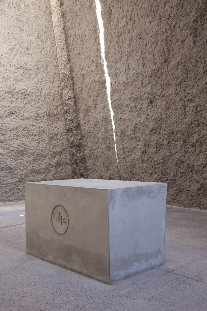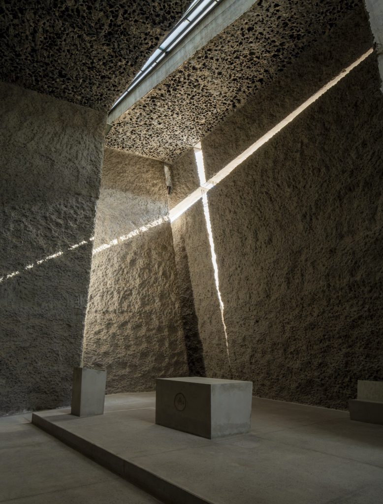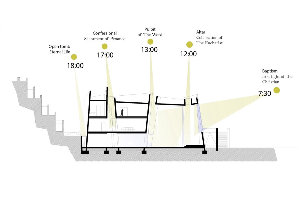 Inside, the architecture turns inward. Light is guided through the fissures to shape an introverted void, where illumination becomes a narrative device that marks the sacraments. At sunrise, a cross casts light behind the altar, evoking the imagery of burial and resurrection while also animating the baptismal font. As the day progresses, overhead openings bring noon light to the altar and to rites of confirmation and communion. Later, a concentrated shaft of light isolates the confessional, turning a private act into a spatial focus. Additional skylights are positioned to support the remaining rituals, allowing the building to operate as a temporal instrument as much as a container.