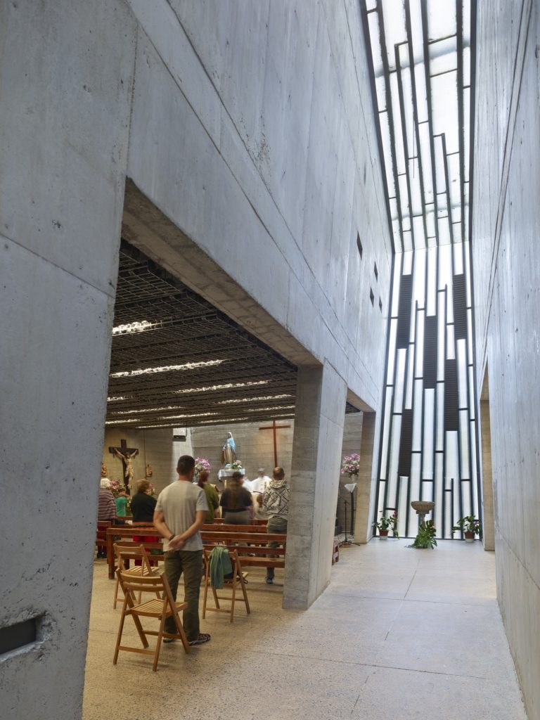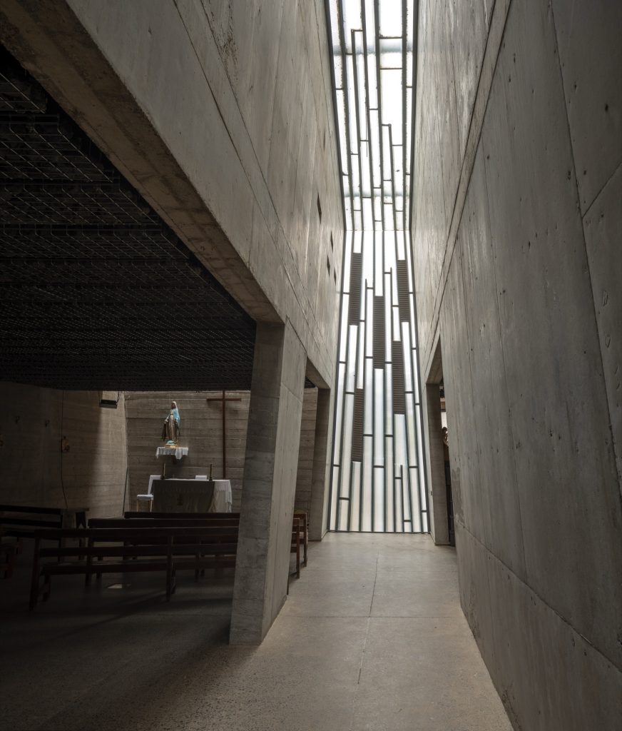 Acoustics are treated with equal seriousness. The project challenges the assumption that concrete is inherently harsh by combining exposed surfaces for diffusion with layers incorporating porous volcanic stone, picón, for absorption. The aim is an auditory clarity closer to opera houses than to the echo chambers often associated with raw concrete, supporting both speech and song in a building that deliberately merges ecclesiastical ceremony with social life.