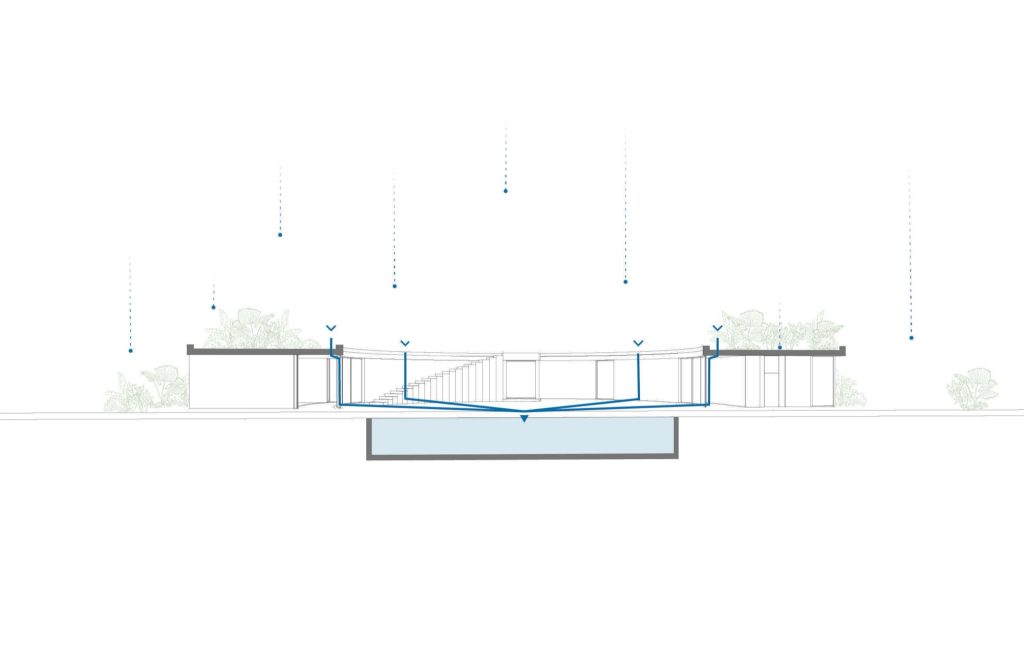 Sustainability is embedded in the project’s logic rather than added as a layer. The house harvests rainwater, generates electricity through solar panels, and uses the same solar system to heat water throughout. Hydronic radiant floors warm the bedrooms, while natural cross ventilation cools the entire house without mechanical dependency.