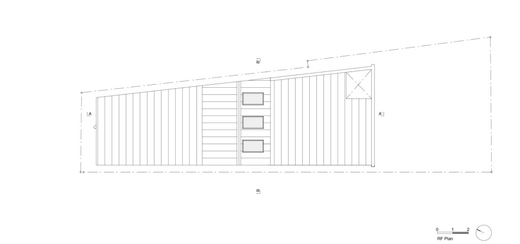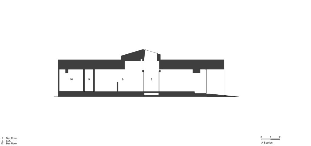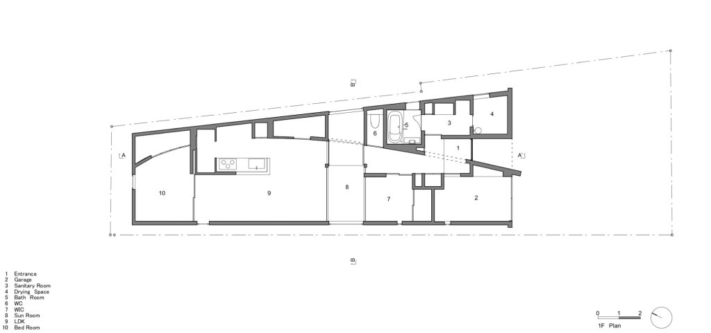 On a narrow plot in Kashiwara, adjacent to a railway line and within immediate proximity to the station, a former bicycle parking area has been transformed into a single storey dwelling for two inhabitants. The site’s elongated geometry and exposure to constant train noise establish the primary architectural conditions. Rather than resisting these constraints, the project internalises them, converting limitation into spatial structure.