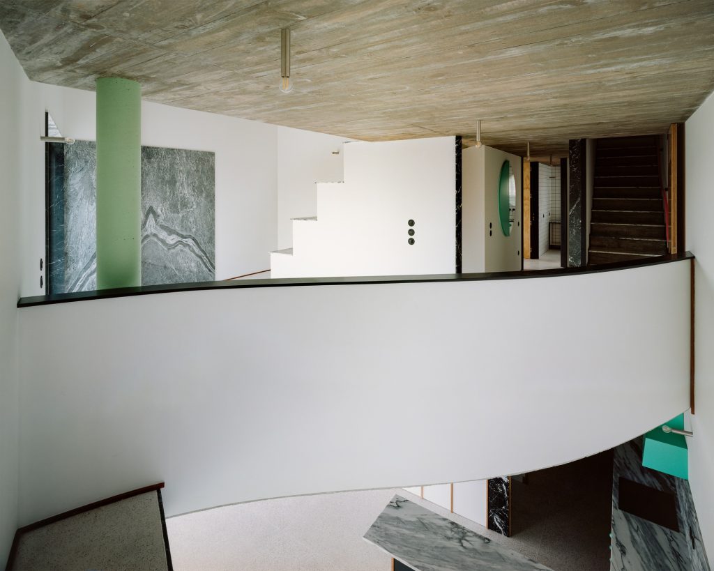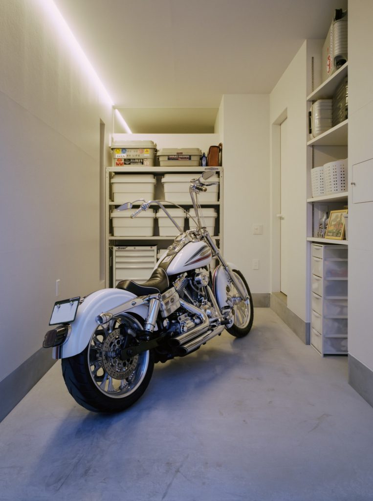 The integration of motorcycle storage within the living environment challenges conventional distinctions between utility and habitation. Rather than relegating functional requirements to peripheral zones, the project absorbs them into the architectural narrative. The house becomes a compact infrastructure for living, where hobbies and rituals coexist without hierarchical separation.