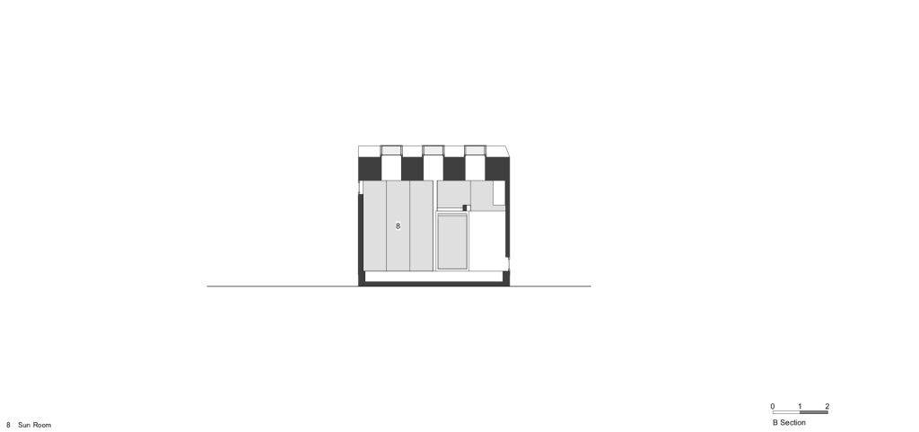 The linear configuration of the site suggested a slender architectural body. To address both daylight penetration and acoustic mitigation, the building is organised into two distinct volumes positioned at the front and rear of the plot. Between them, a sunroom operates as an environmental mediator.