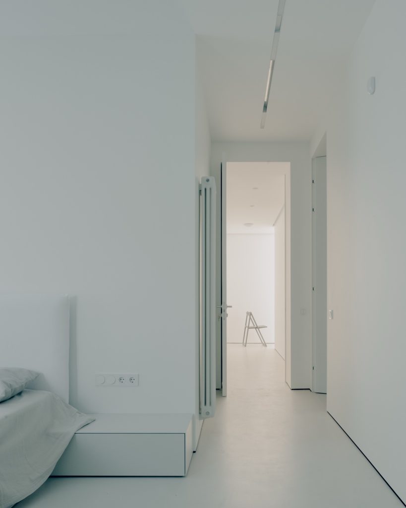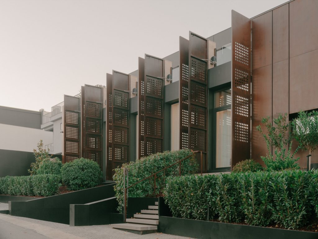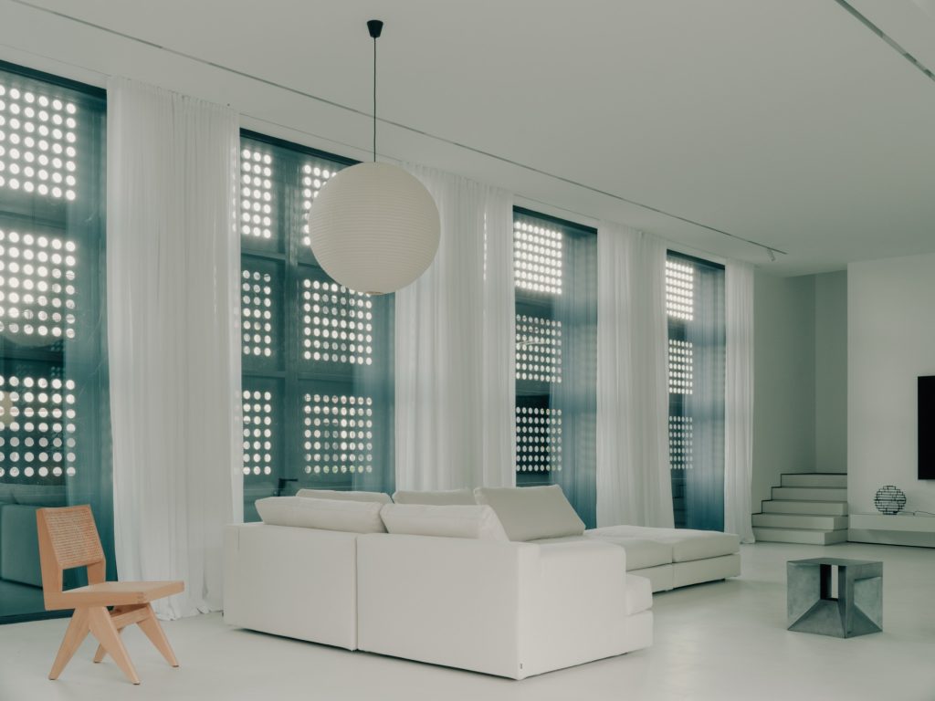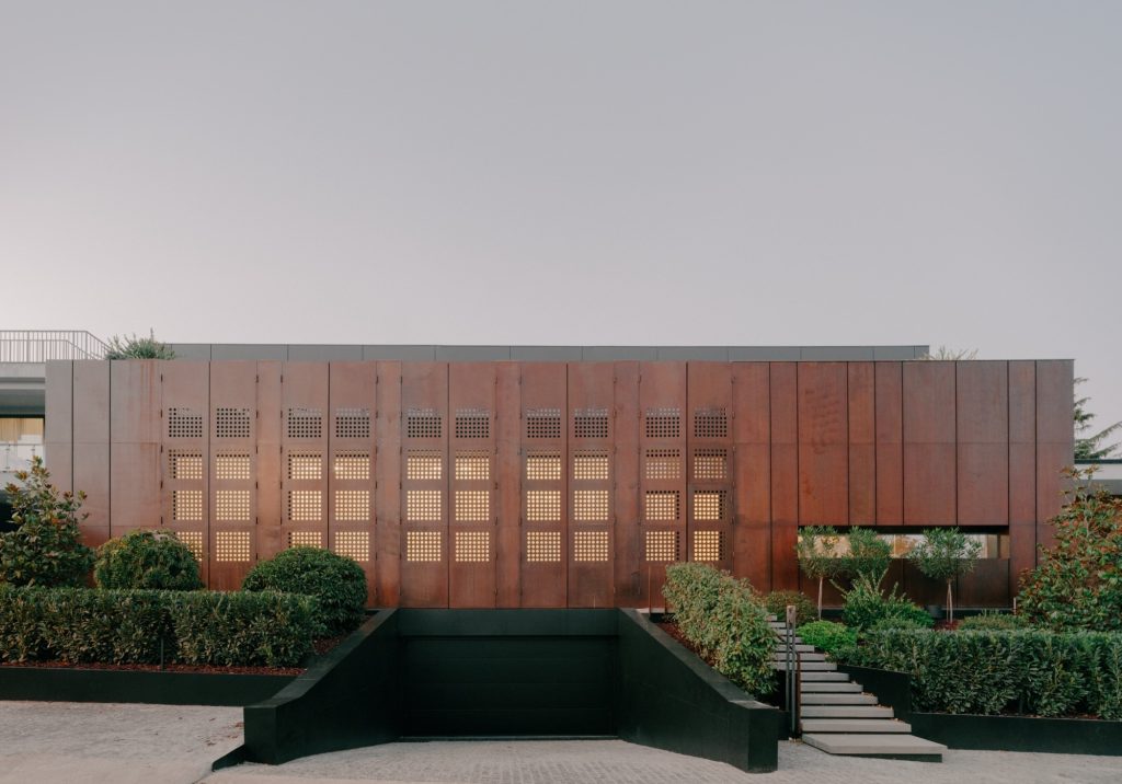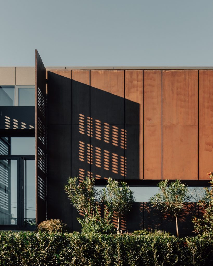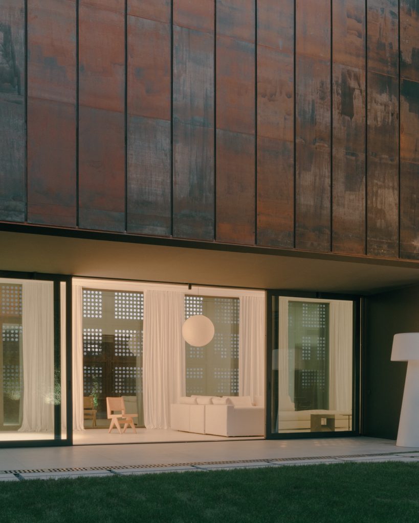 Materially, the project is defined by contrast. The exterior expresses weight and permanence through oxidized steel, while the interior adopts a restrained palette of white surfaces and light flooring. Within this calm environment, light becomes the primary medium. Filtered through perforated screens, it produces soft, evolving patterns that animate the domestic space.