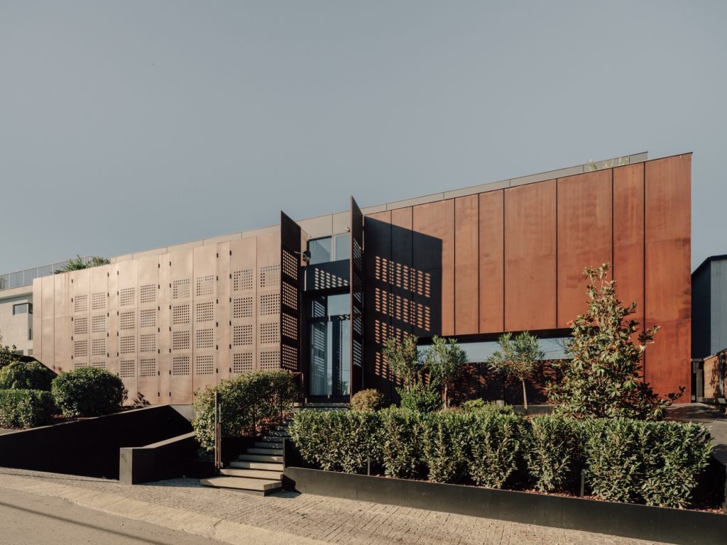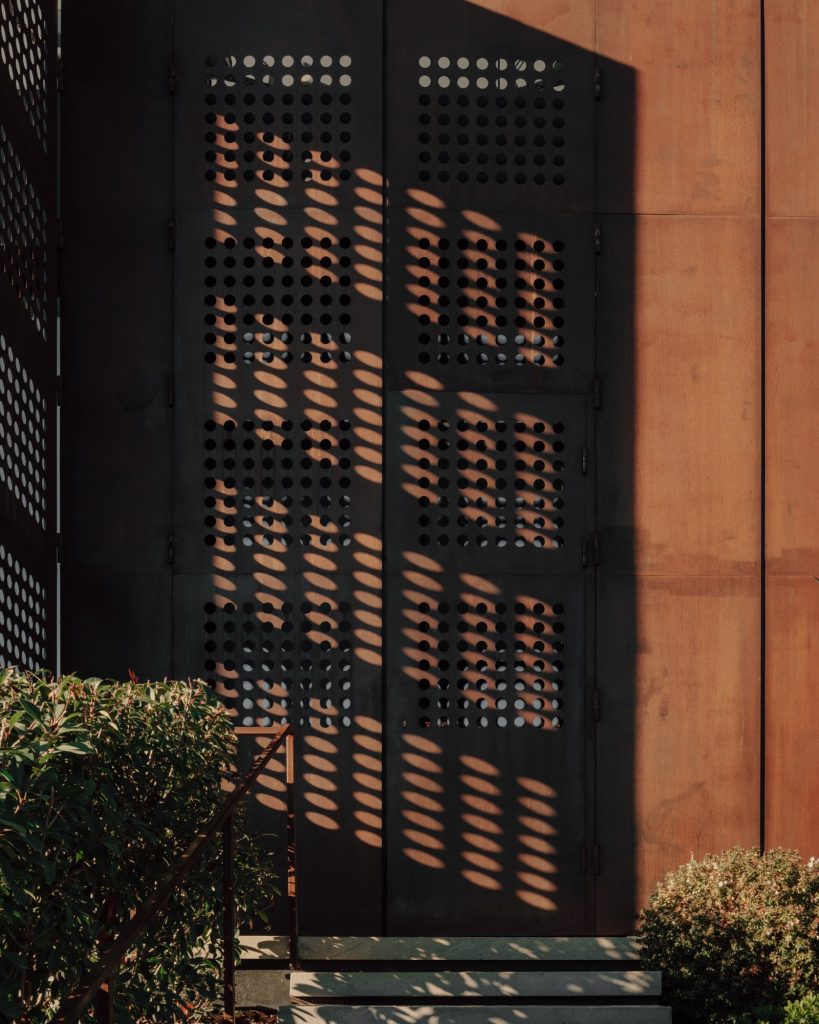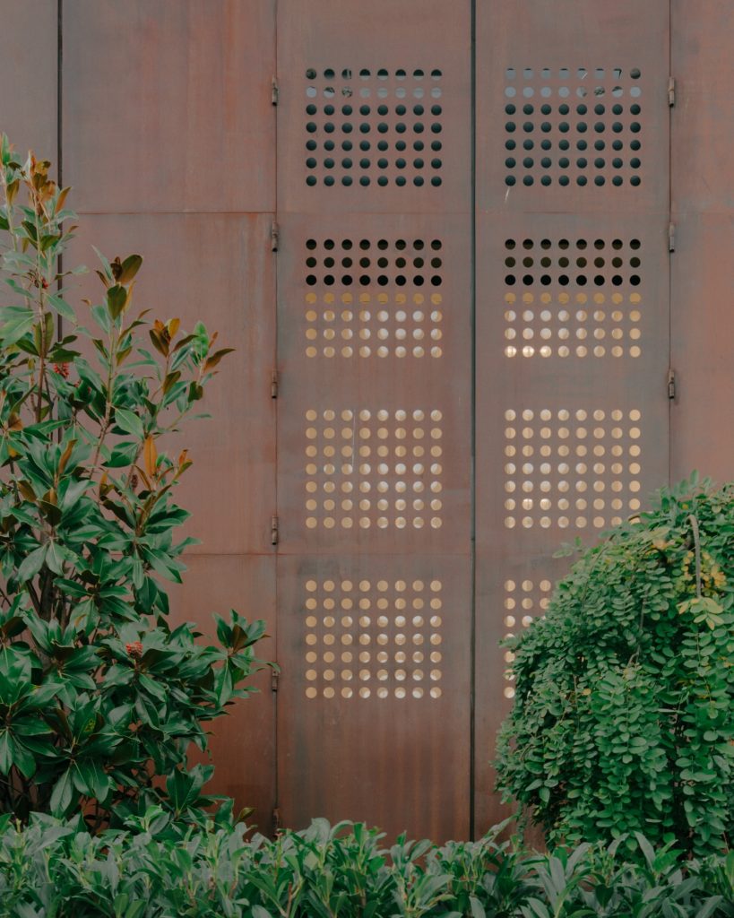 Rather than reproducing the fragmented streetscape defined by fences, the house forms a continuous protective perimeter around the site. Its street façade appears as a monolithic surface of weathered steel, interrupted only by a sequence of large perforated iron doors. These pivoting panels operate as both environmental filter and spatial device. When closed, the building reads as a solid shield, reinforcing privacy and protection. When opened, it transforms into a permeable structure, allowing air, light, and views to penetrate deep into the interior.