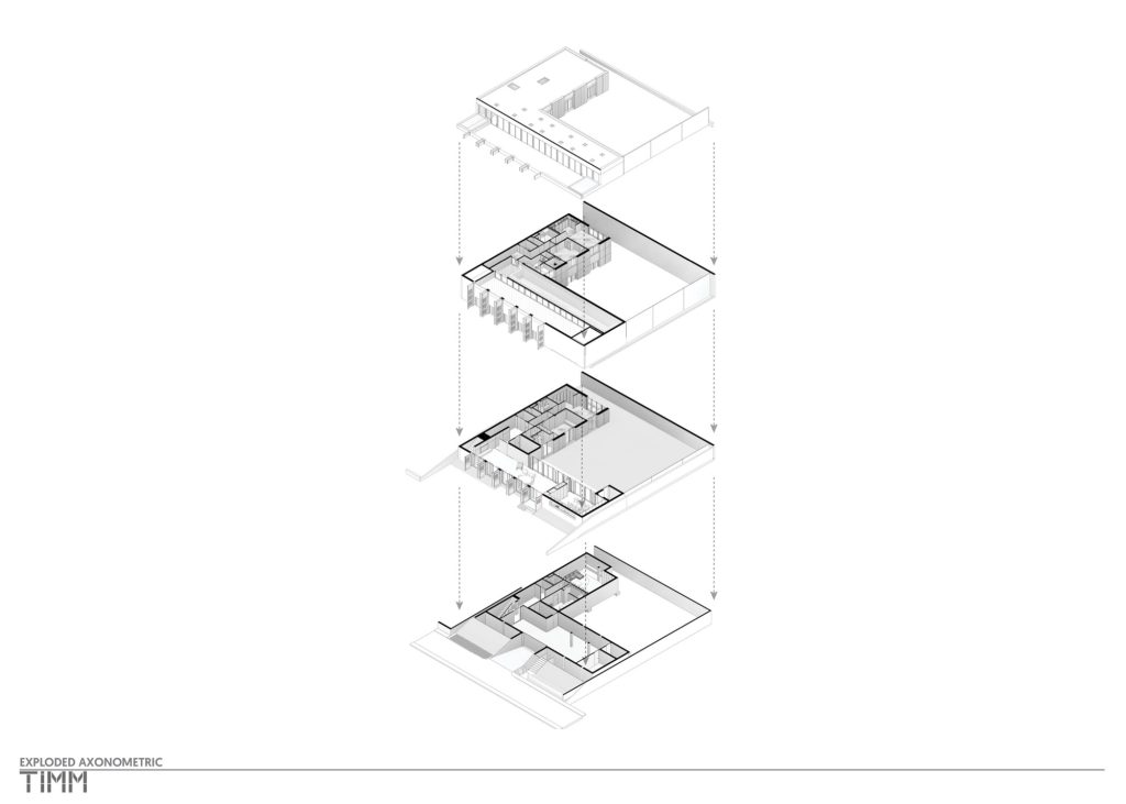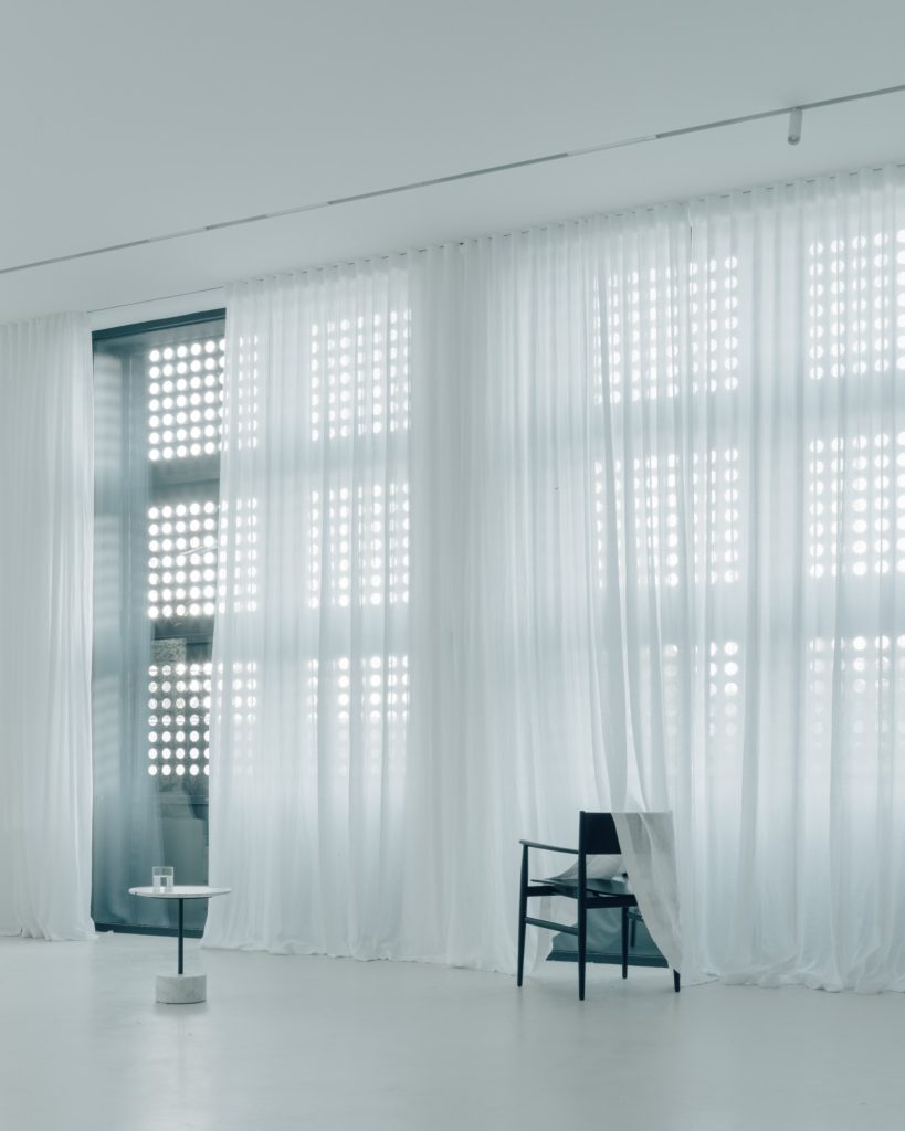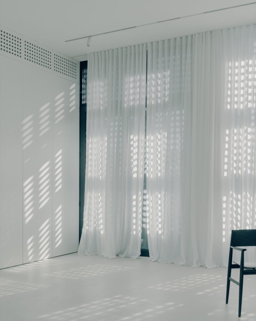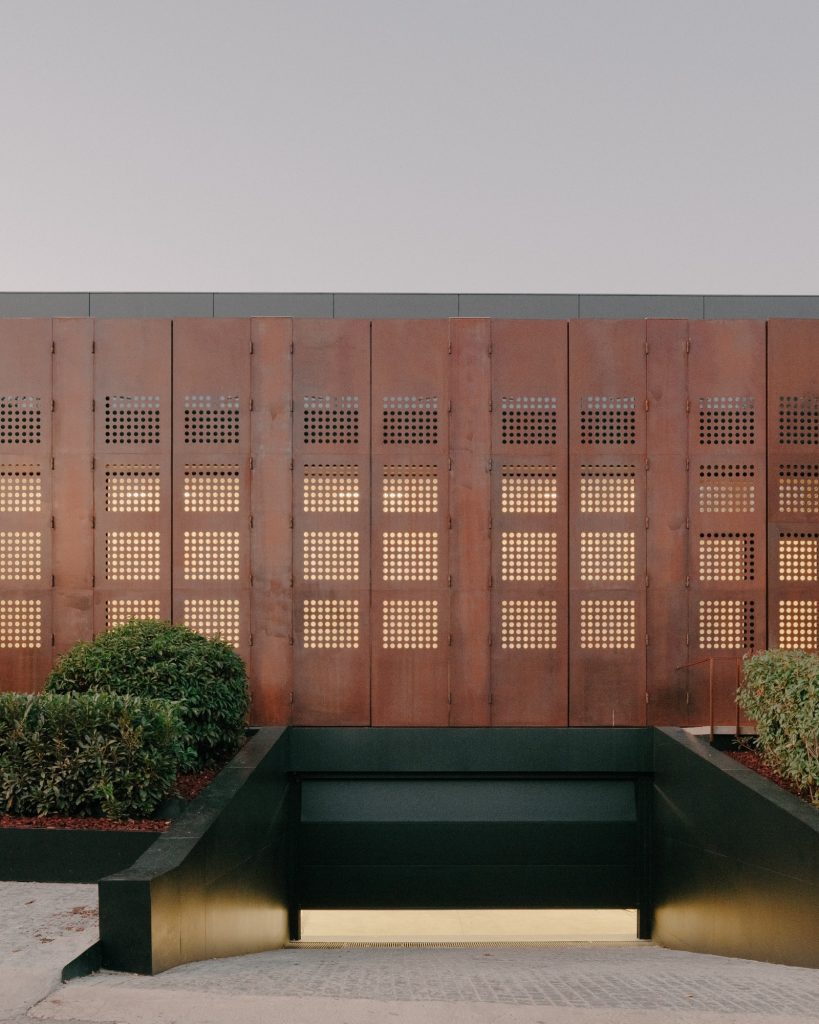 The perforated surfaces introduce a temporal dimension to the façade. Light filters through the openings, casting shifting patterns across floors and walls throughout the day. What appears rigid and defensive from the outside reveals a dynamic and responsive interior condition.