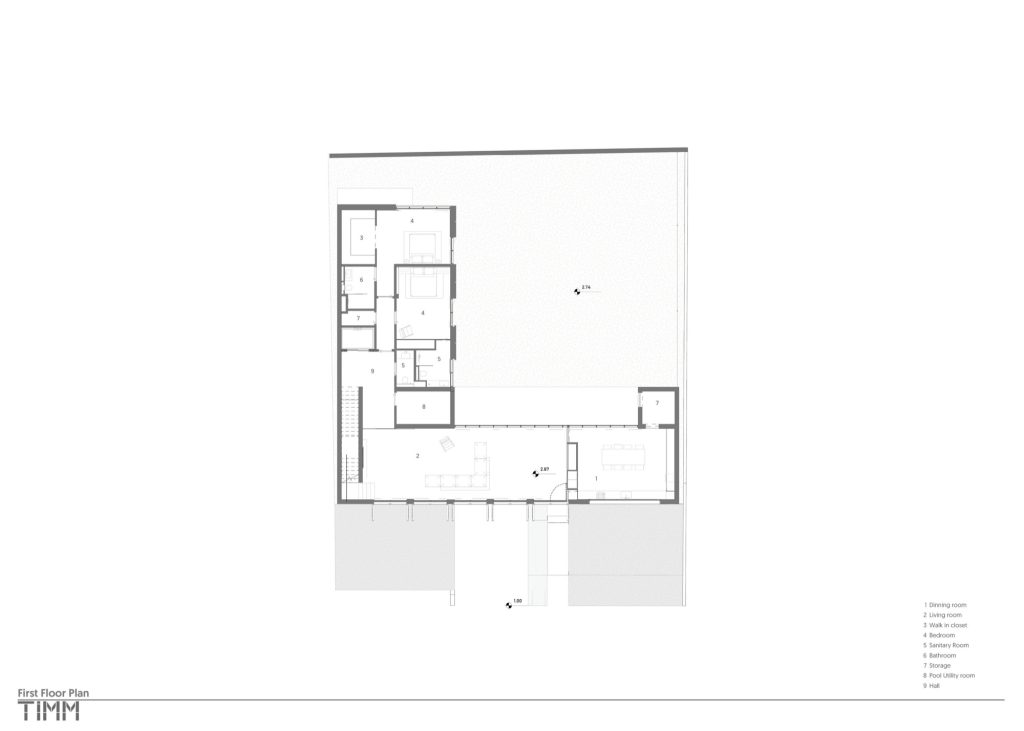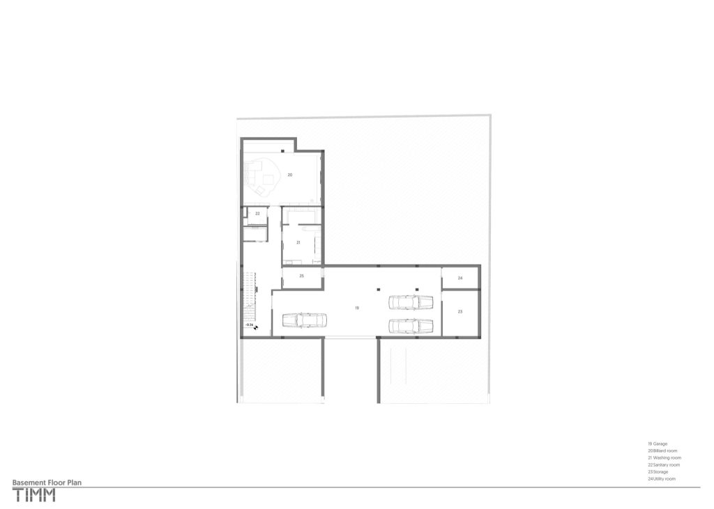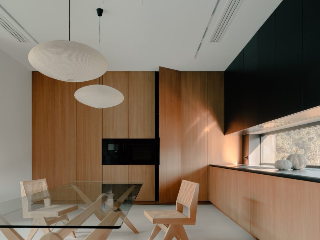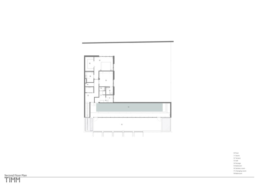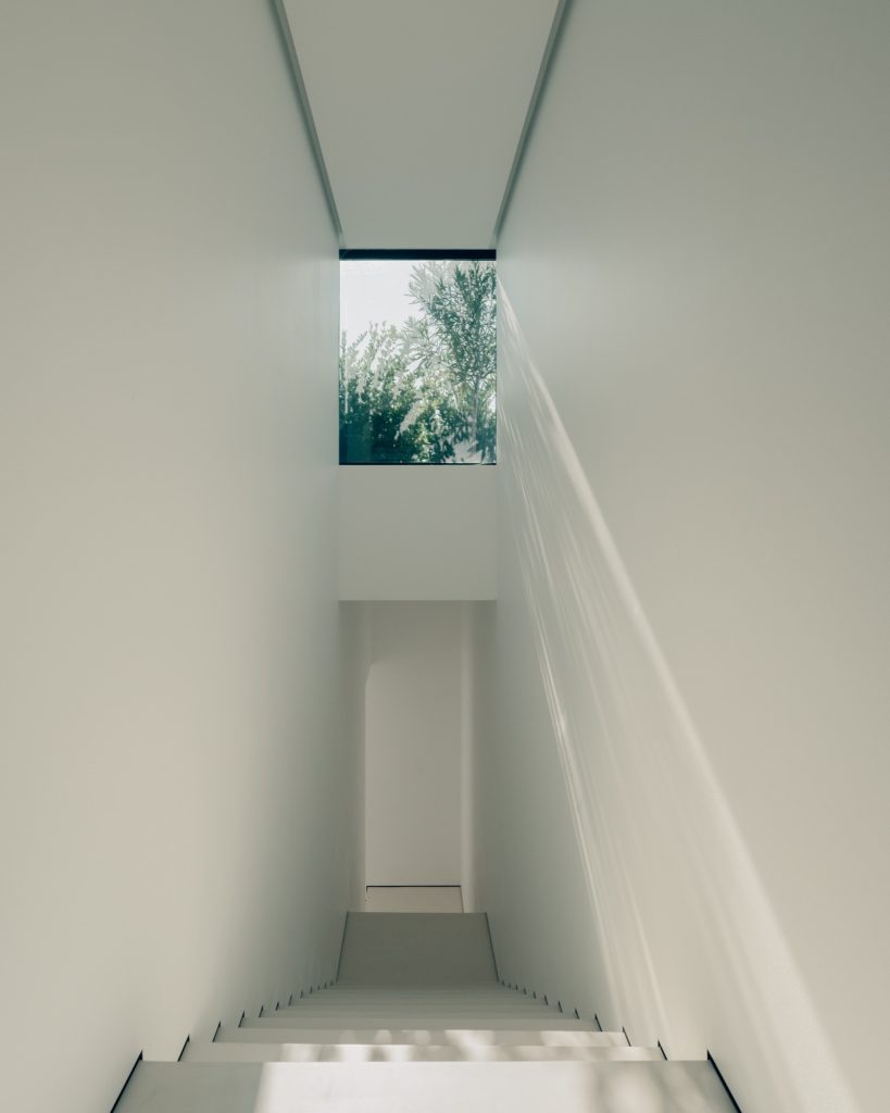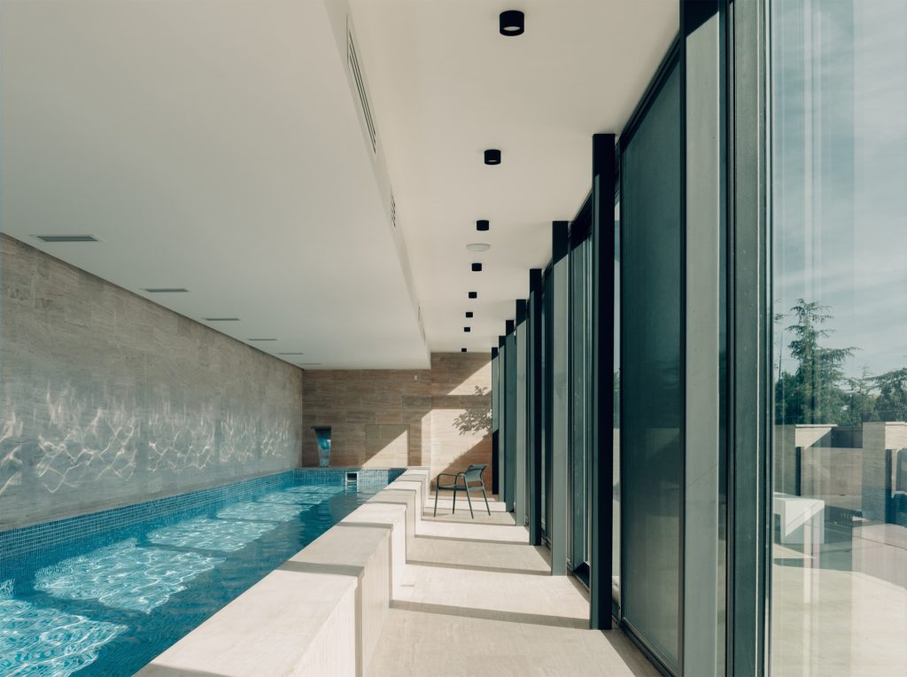 Additional functions are distributed vertically. The lower level accommodates parking and technical spaces, while upper levels introduce amenities such as an indoor pool and terraces. These elements extend the spatial logic of enclosure and openness, maintaining a consistent relationship between light, privacy, and landscape.