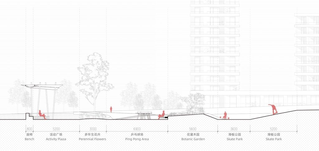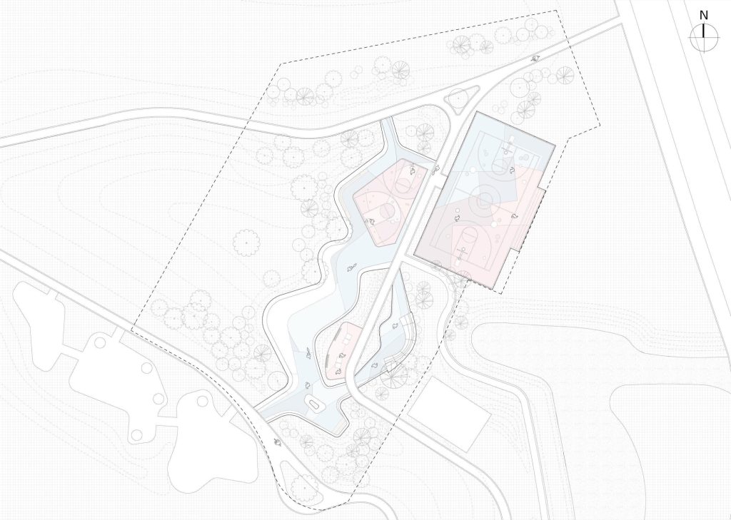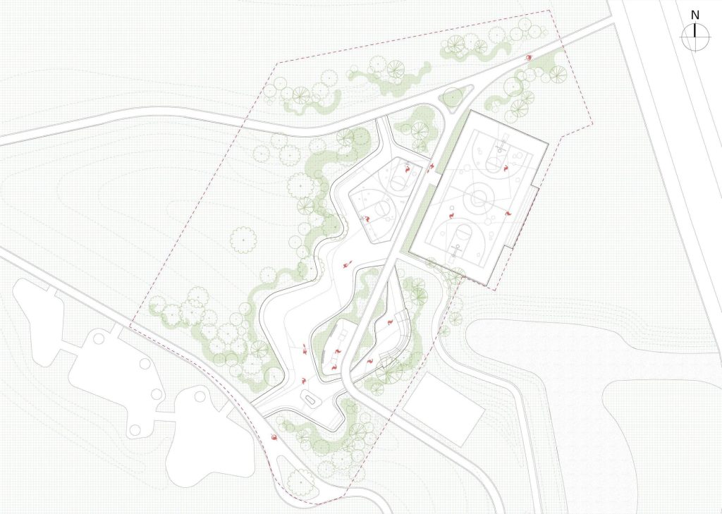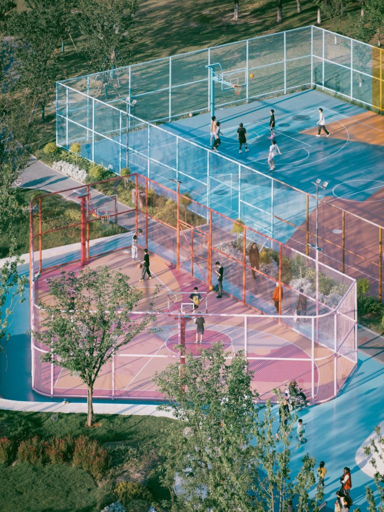Beyond the skate area, other sports and leisure spaces are arranged to maintain visual openness and functional flexibility. Basketball courts, ping pong tables, children’s play elements, and a signature pavilion coexist within a coherent spatial framework. Circulation paths are carefully calibrated to minimize conflict between different activities while encouraging casual encounters and shared use.