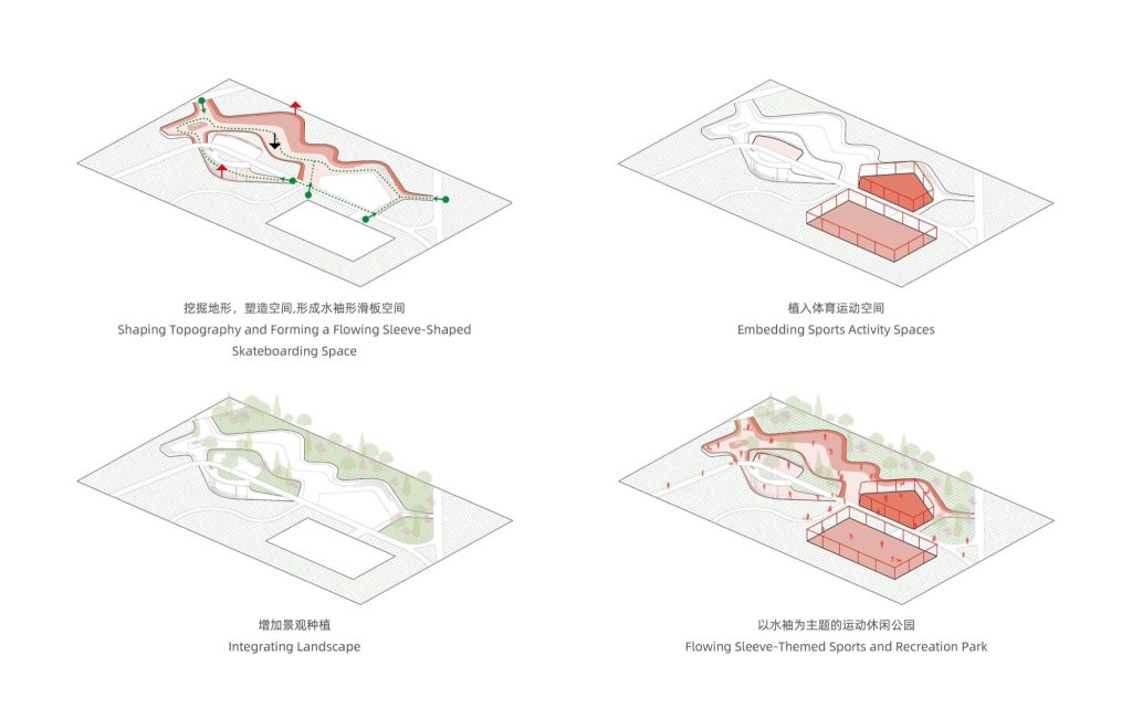 The park’s design draws from the imagery of water sleeves in Kunqu opera, a classical performance art known for its restrained gestures and flowing extensions of fabric. This poetic reference is not applied symbolically but translated into spatial logic. Curved lines and continuous surfaces unfold across the site, guiding movement and shaping zones with an intuitive clarity. The abstracted sleeve forms merge with the ground plane, allowing users to experience the park as a sequence of flowing transitions rather than discrete areas.