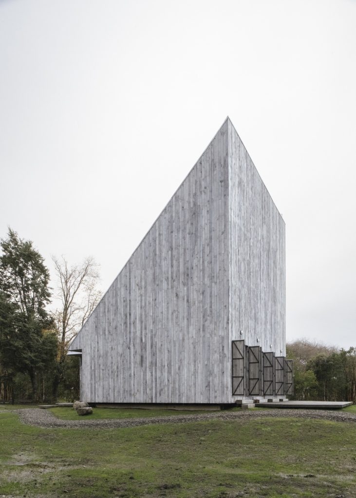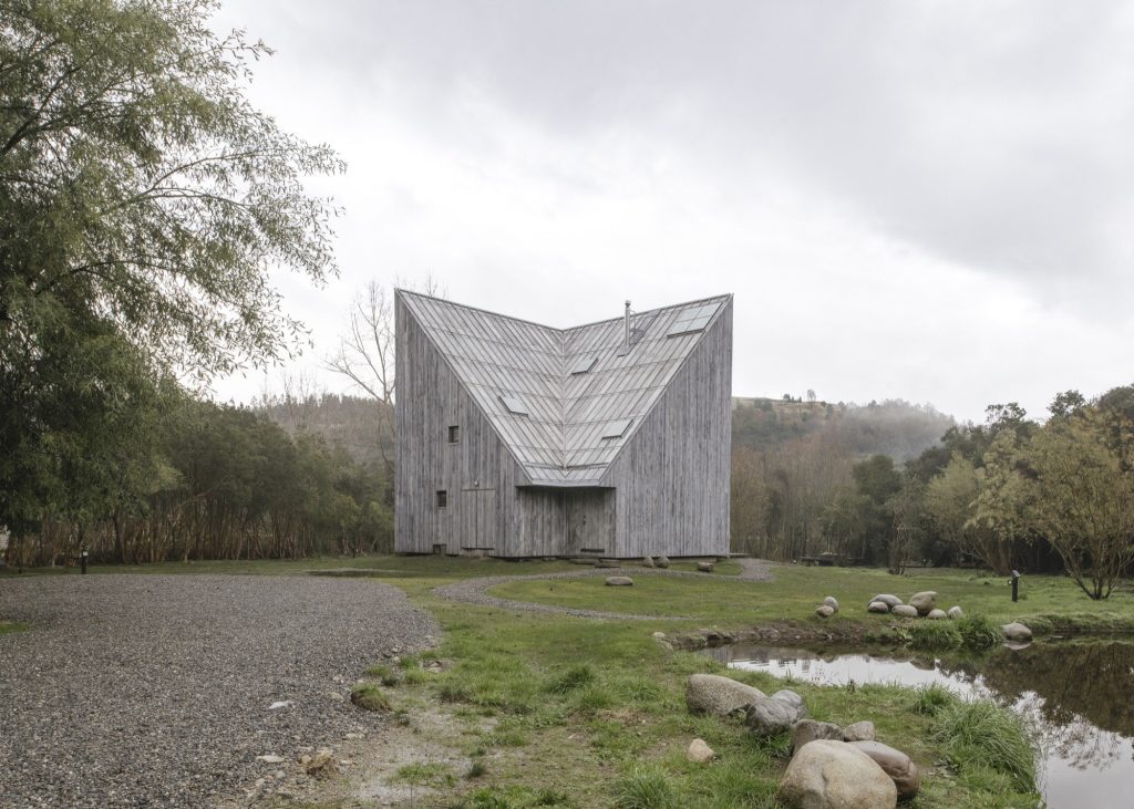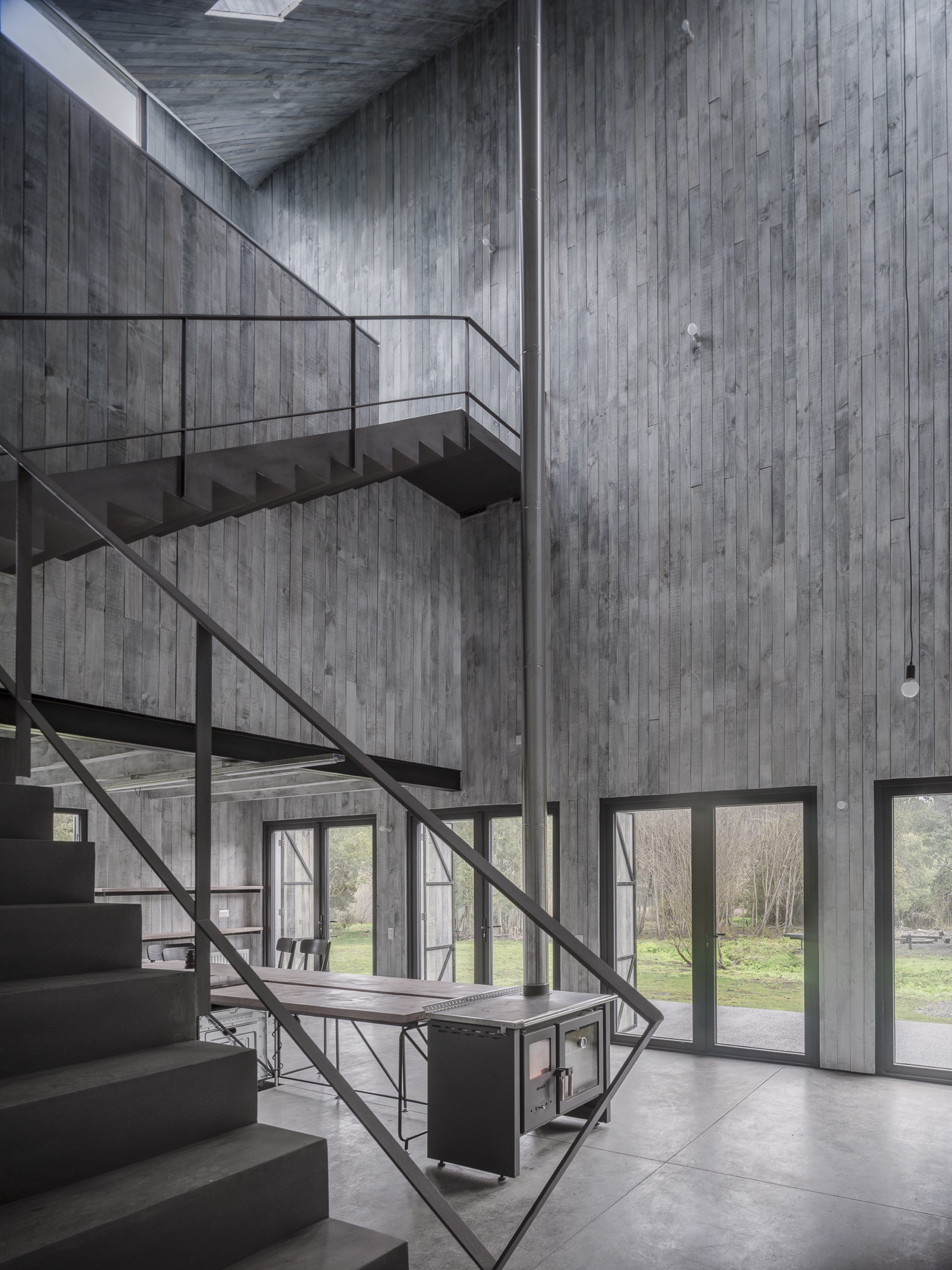 Humo House is clad inside and out in raw timber slats, individually stained to create a surface that feels both precise and weathered. The choice is less about rustic effect than tonal continuity: in the region’s foggy mornings, the timber reads as an extension of the forest’s muted palette. The house does not compete with the landscape, it absorbs it, allowing light, moisture and shadow to complete the material expression over time.