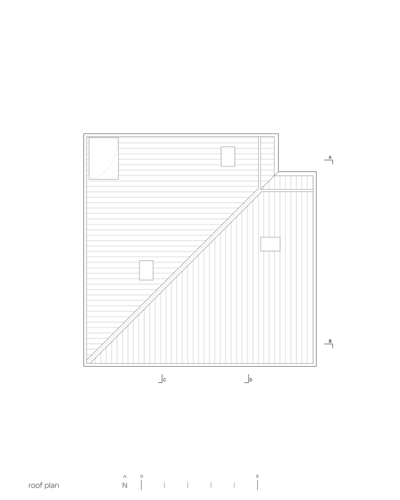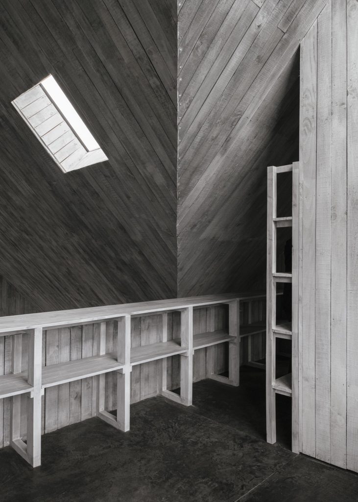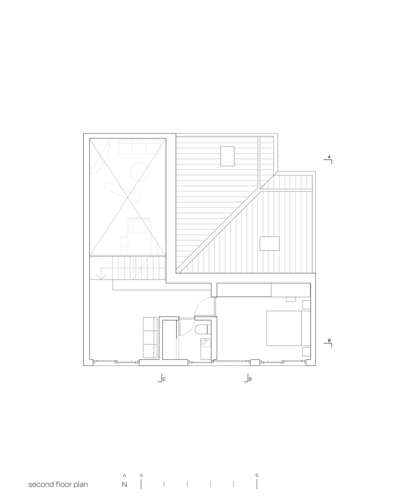 Above, the second floor holds a study that opens toward the triple-height space below. From here, the building’s defining geometry becomes most legible, as the sloped roof turns the void into a spatial event rather than simply an absence.