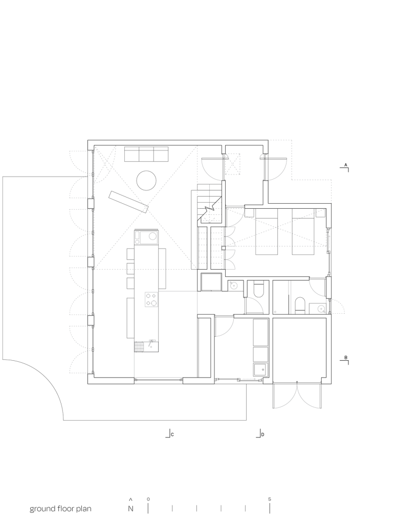 Inside, the plan reinforces the same logic of duality. One half of the house is given to public life as a single open volume that rises through the full height of the building. It is expansive without being noisy, a room that trades ornament for proportion and air, letting the geometry do the work. The other half stacks the private world across three levels, organizing daily routines and guest accommodation with a sense of separateness that still feels connected. The result is a home that performs a familiar contemporary wish: togetherness without friction, intimacy without collapse.