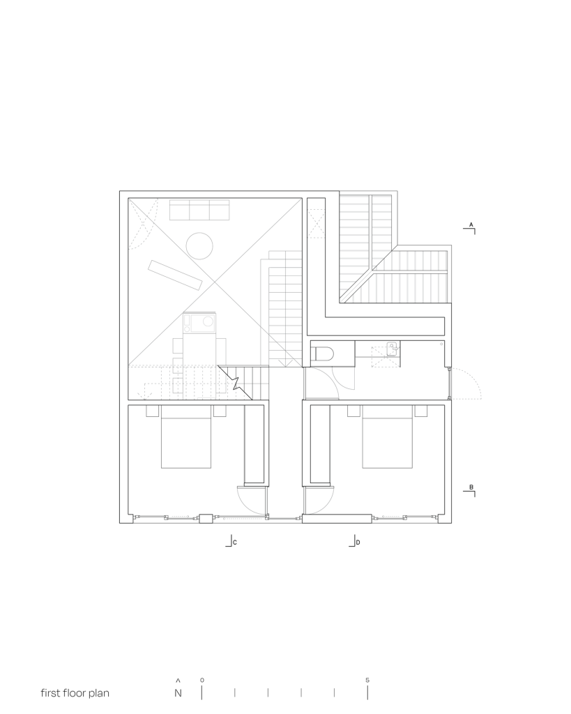 The first floor is organized around a pair of master bedrooms, one for each partner. The arrangement reads like a negotiation made architectural: doors connect, a shared corridor mediates, and proximity is offered without being imposed. It creates the possibility of intimacy on demand while preserving autonomy as a default, a plan that recognises how contemporary couples often live with parallel rhythms.