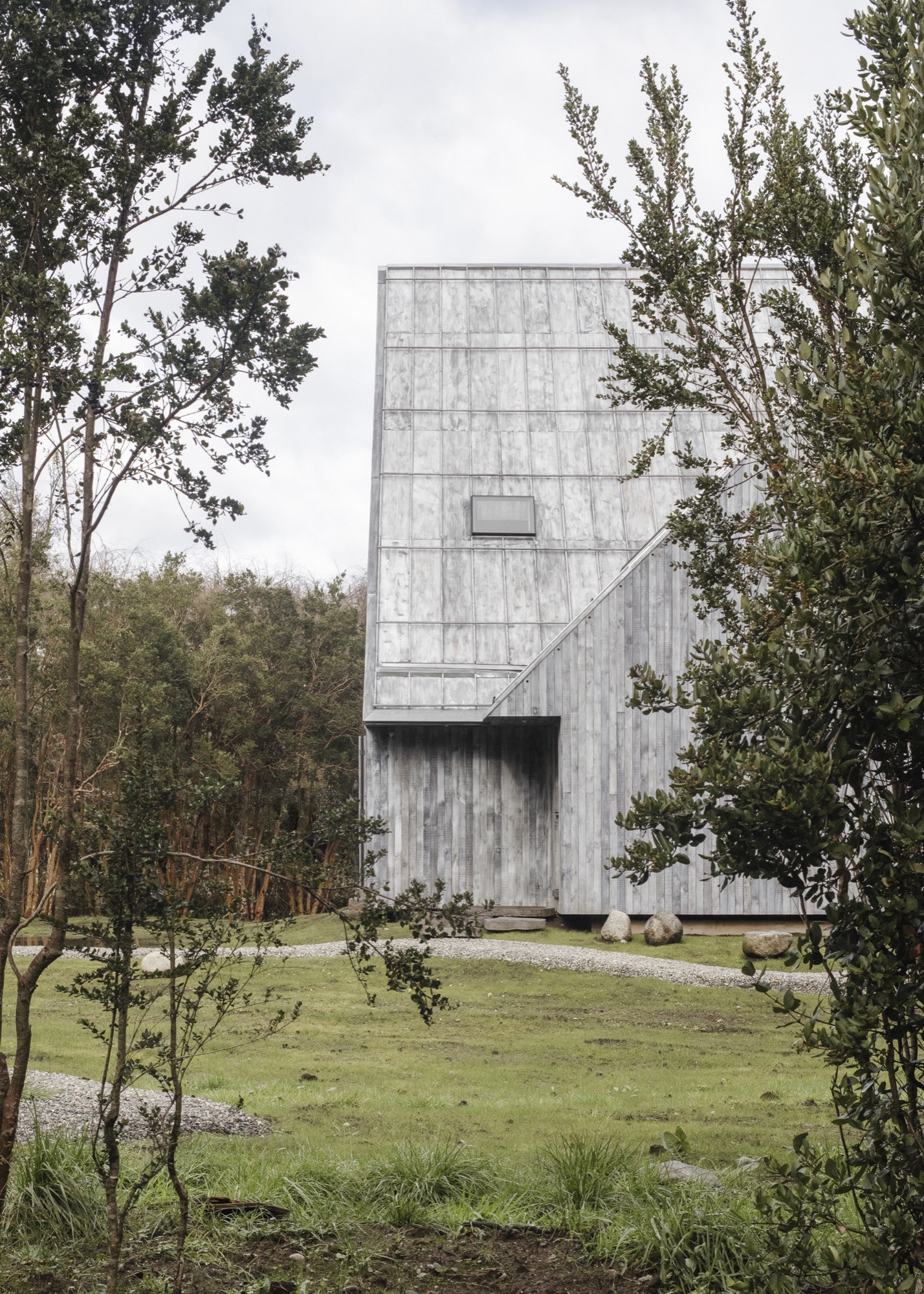Set on a long, narrow property in southern Chile, Humo House sits inside a natural clearing that feels both protected and deliberately withheld. Trees press close on one side, while a small stream runs along the other. Dense vegetation erases any easy reading of the broader landscape. The lake is not announced by a panorama but suggested by sound, the steady movement of water pulling the gaze forward, beyond what the site is willing to reveal.