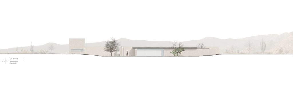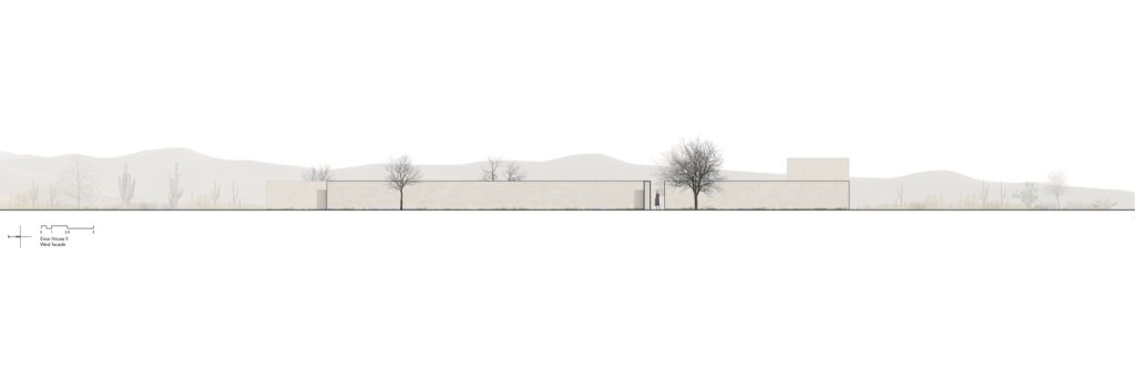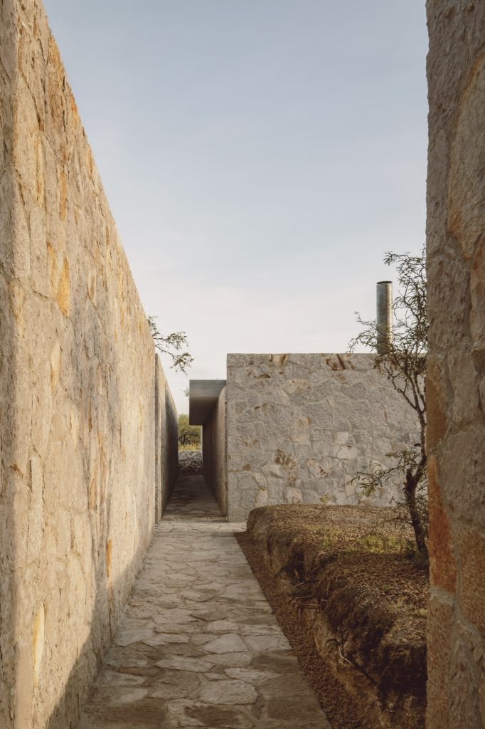The fourth quadrant houses the office. Unlike the predominantly horizontal composition of the rest of the house, this space rises vertically above the landscape. Its restrained verticality recalls the monolithic structures of the nearby Santa Brígida mines in Mineral de Pozos, whose austere architecture reduces material and form to their most essential expression.