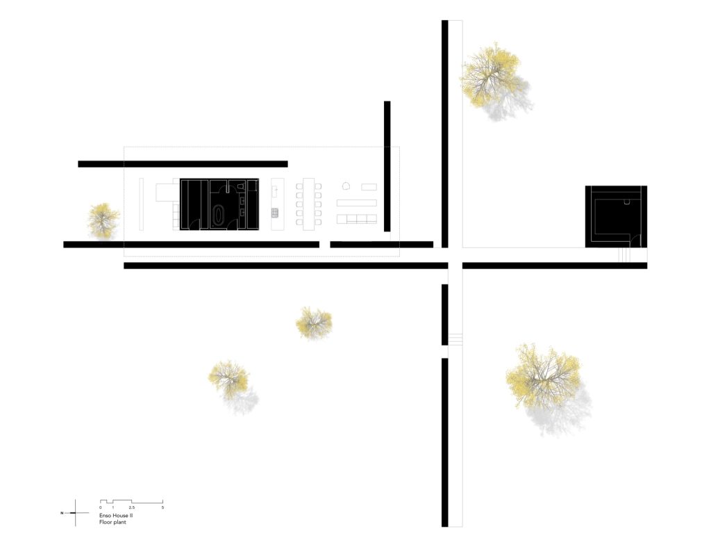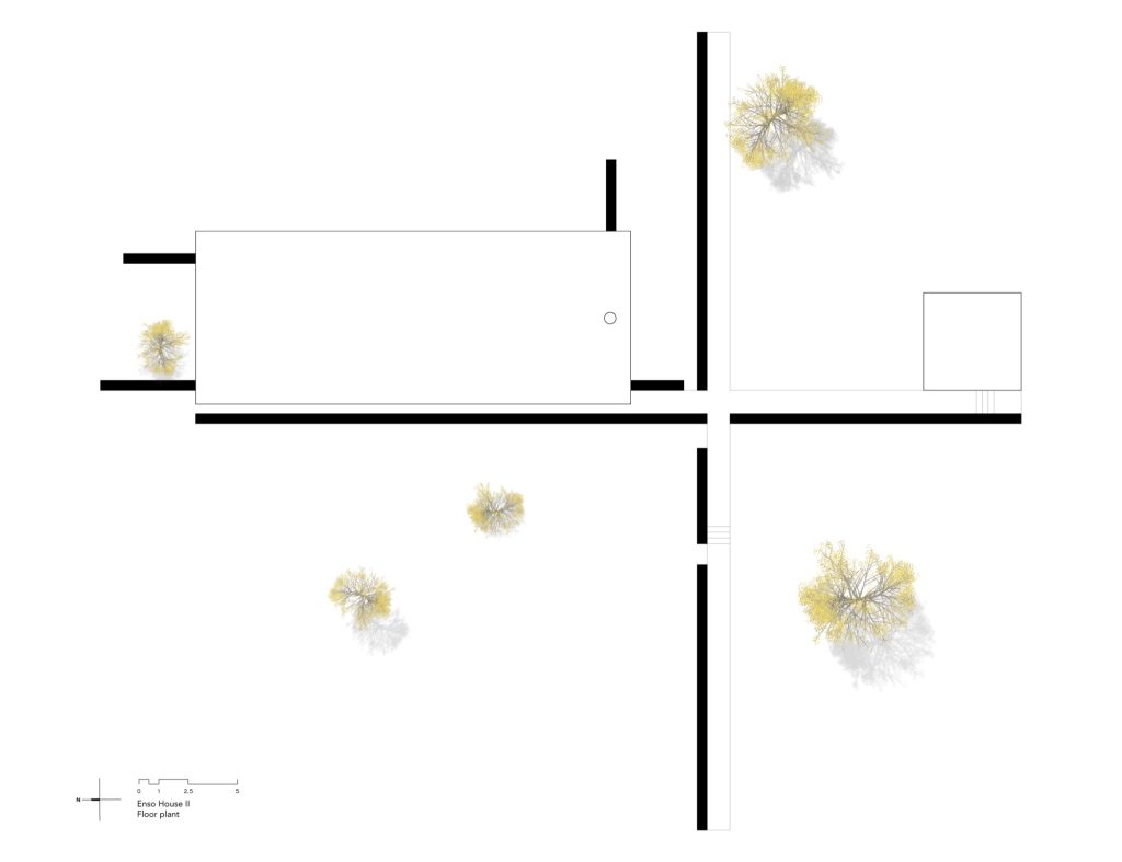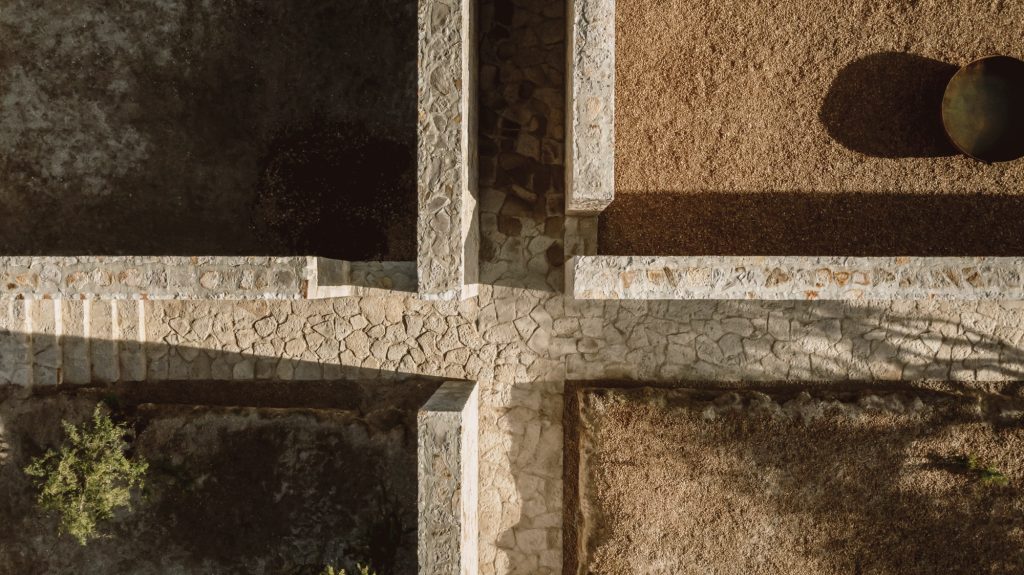 To enter the house, a second wall intersects the first at a perpendicular angle. This gesture accompanies the arrival sequence, creating a shaded path that gradually prepares visitors for the interior. The intersection of these two walls establishes the organisational logic of the project: a cruciform plan that structures the entire house.